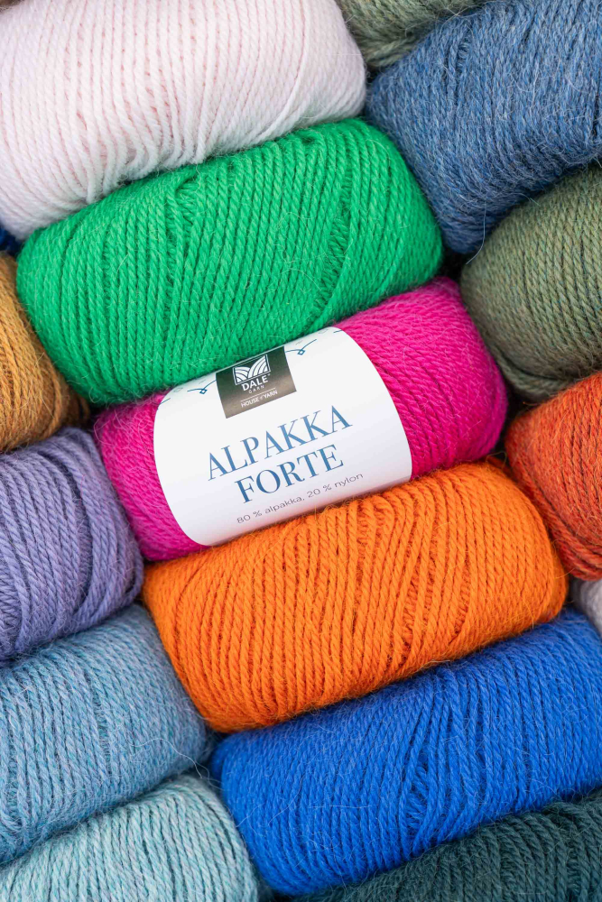 Alpakka Forte er et forstærket alpacagarn i 80% Alpaca og 20% Nylon, der kommer i fine, melerede nuancer. Garnet er lige så blødt og behageligt som ren alpaca, og farverne er særligt smukke i alpacafiber. Vi anbefaler Alpakka Forte til både trøjer, jakker og nederdele, og den er dejlig til lækkert tilbehør samt tyndere sokker og strømper. Garnet er oplagt til børnetøj, der skal tåle at blive brugt og slidt. Alpakka Forte har samme løbelængde og strikkefasthed som Dale Alpakka og Alpakka Space Dye. Opskrifterne kan bruges i flæng, så her er der plads til at lege med garn og farver.
