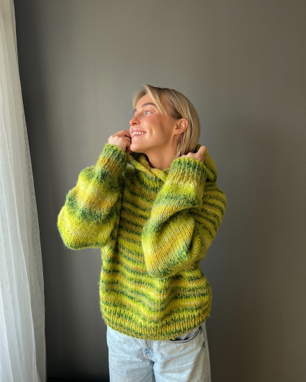 Du kan selv ændre farven på strikkepakken; vælg først den størrelse du vil strikke, så vises udvalget af farver herunder. Bemærk! Strikkeopskriften leveres altid i strikkepakkens originale farver: Grønfarvet Print og Pæregrøn