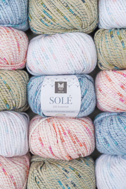 SOLÉ er et unikt bomuldsgarn med en ensfarvet, kabelspundet kerne, der er omgivet af en tynd, flerfarvet tråd. Kombinationen giver et meget eksklusivt farvespil og udtryk. SOLÉ er et spændende sommergarn, der passer lige godt til bluser, cardigans, kjoler og sommertoppe.
