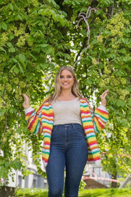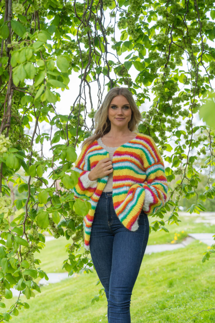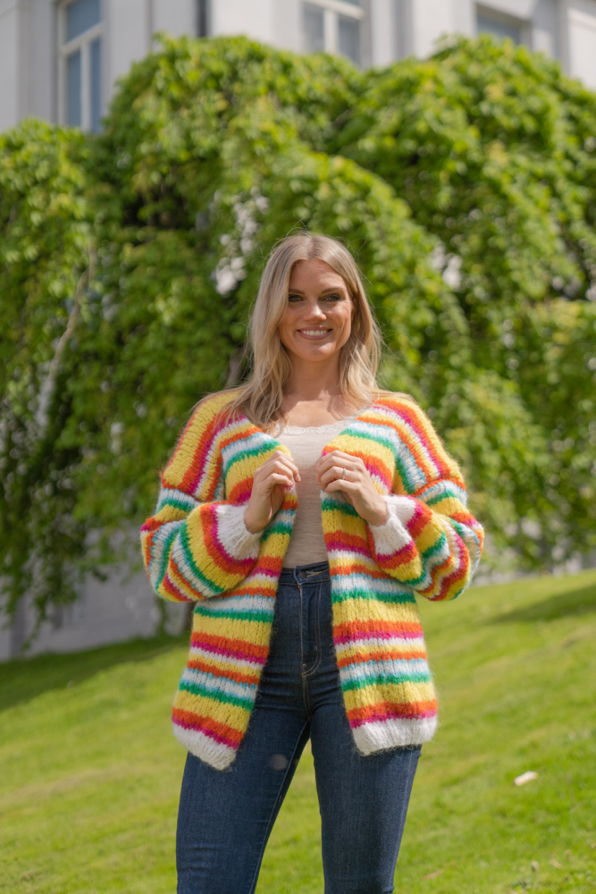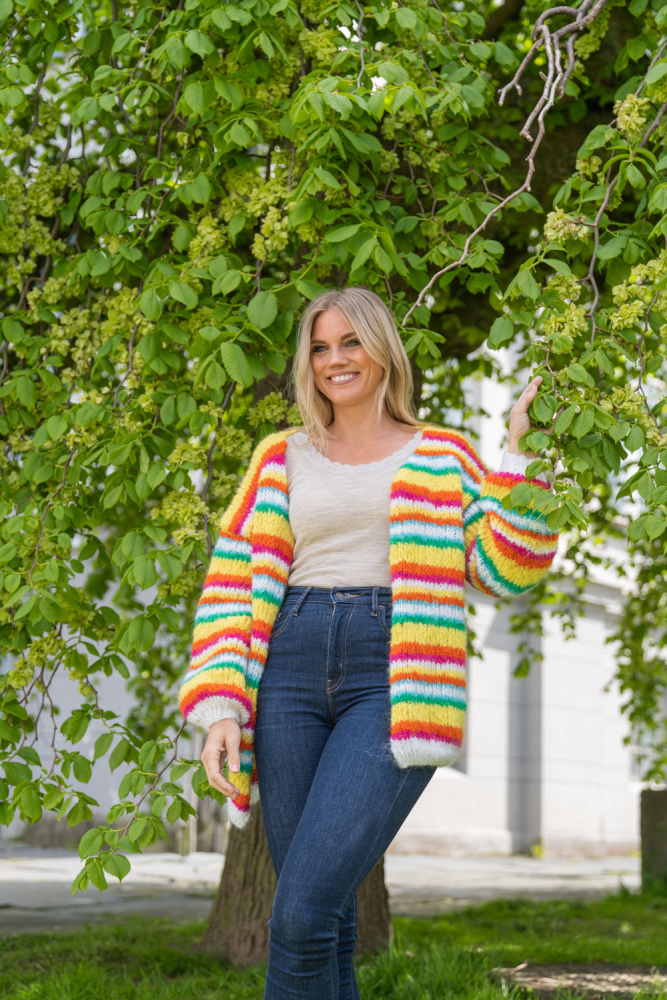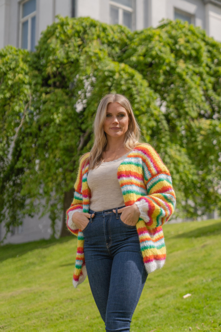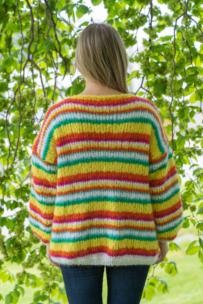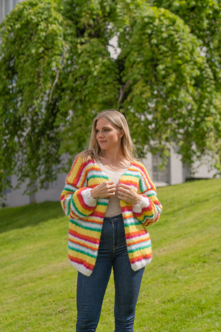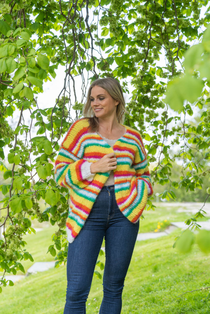 Happy cardigan er farvestænket, der gør dig glad! Nemt og hurtigt at strikke på tykke pinde, med en oversized pasform. Den er lækker!