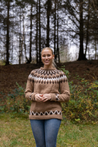 Du kan selv ændre farven på strikkepakken; vælg først den størrelse du vil strikke, så vises udvalget af farver herunder. Bemærk! Strikkeopskriften leveres altid i strikkepakkens originale farver: Karamel, Lys Denim, Hvid og Mørk Brun