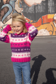 Du kan selv ændre farven på strikkepakken; vælg først den størrelse du vil strikke, så vises udvalget af farver herunder. Bemærk! Strikkeopskriften leveres altid i strikkepakkens originale farve: Purpur, Lys Rosa og Pink