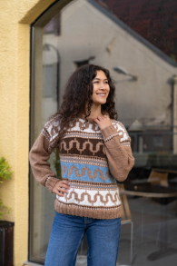 Du kan selv ændre farven på strikkepakken; vælg først den størrelse du vil strikke, så vises udvalget af farver herunder. Bemærk! Strikkeopskriften leveres altid i strikkepakkens originale farver: Karamel, Mørk Brun og Hvid