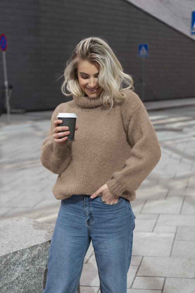Furu Trøjen er en blød og lækker jumper med høj hals og påstrikkede ærmer – perfekt på kølige forårsdage!