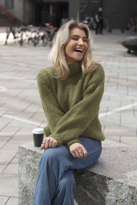 Furu Trøjen er en blød og lækker jumper med høj hals og påstrikkede ærmer – perfekt på kølige forårsdage!