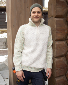 Ole Torkel har en Eventyrlig Zip-trøje i størrelse L på.