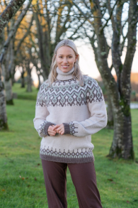 Du kan selv ændre farven på strikkepakken; vælg først den størrelse du vil strikke, så vises udvalget af farver herunder. Bemærk! Strikkeopskriften leveres altid i strikkepakkens originale farver: Kitt og Lillafarvet Print