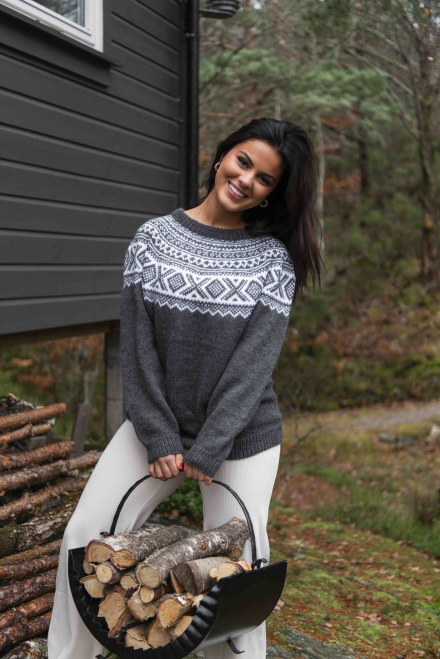 Du kan endda ændre farven på strikkepakken; vælg først den størrelse du vil strikke, så vises udvalget af farver herunder. Bemærk! Mønster bliver altid leveret i strikkepakkens originale farver: koksgrå og hvid