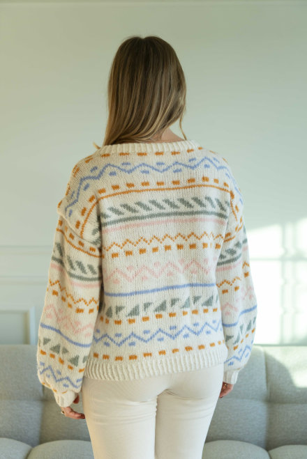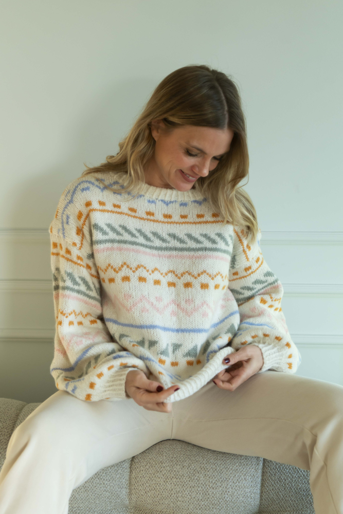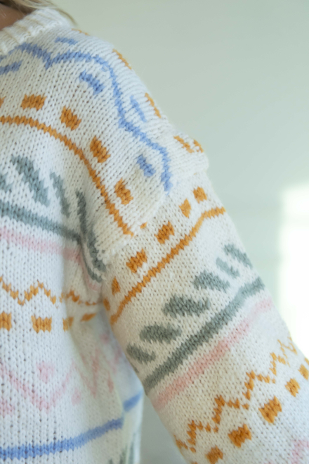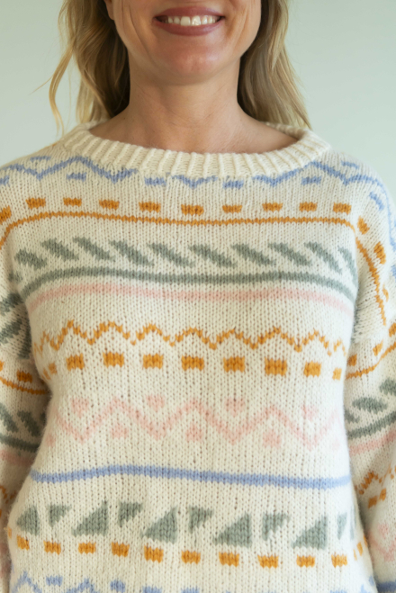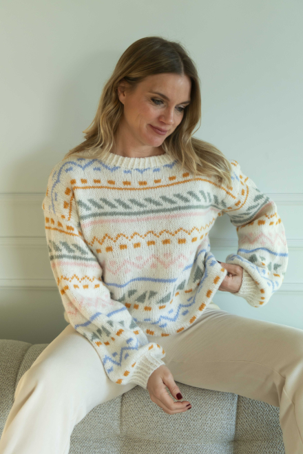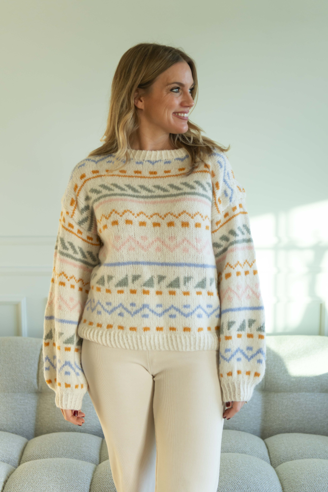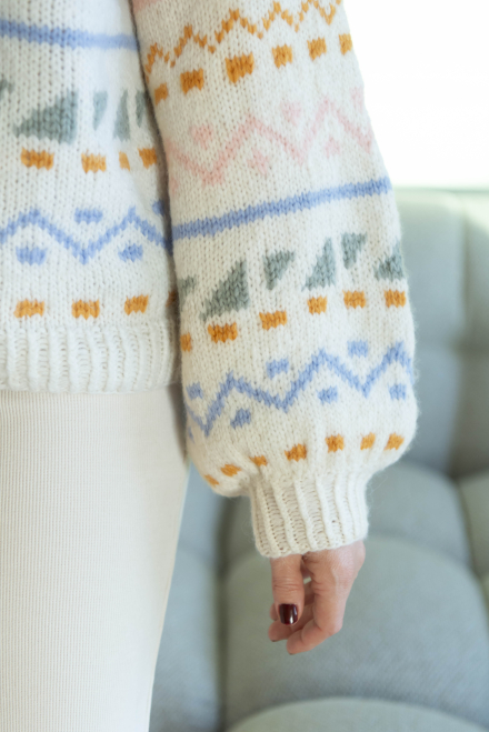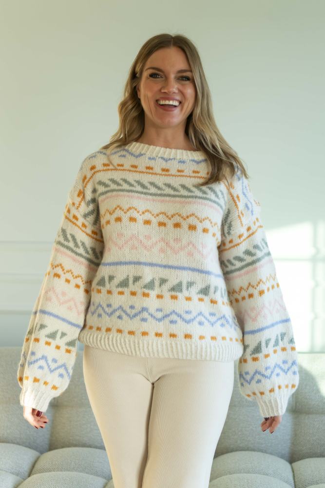 Du kan selv ændre farven på strikkepakken; vælg først den størrelse du vil strikke, så vises udvalget af farver herunder. Bemærk! Strikkeopskriften leveres altid i strikkepakkens originale farver: hvid, okker, lyseblå, lysegrøn og abrikos