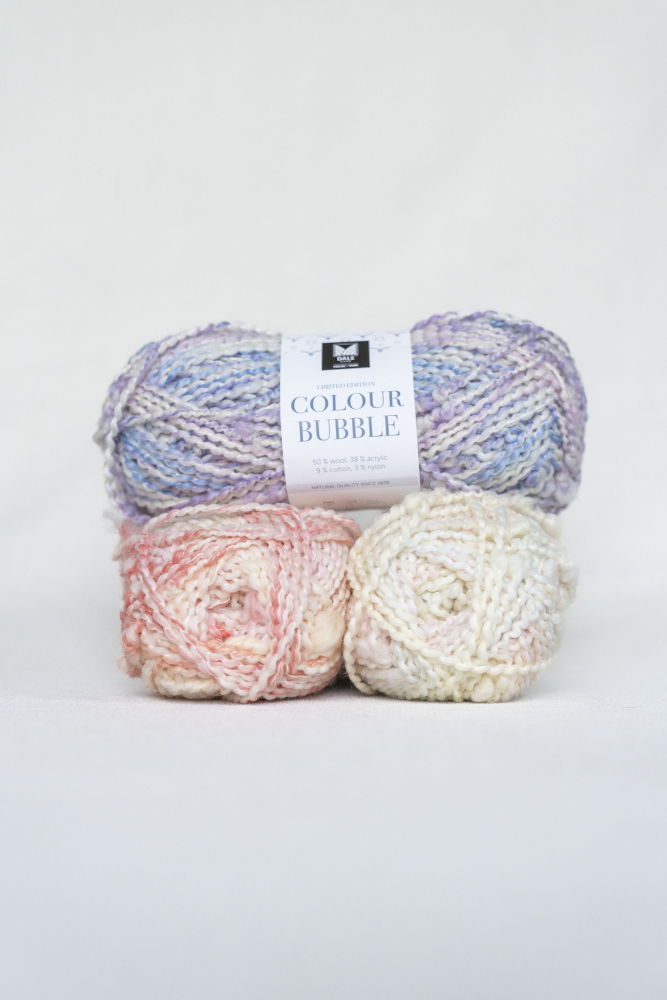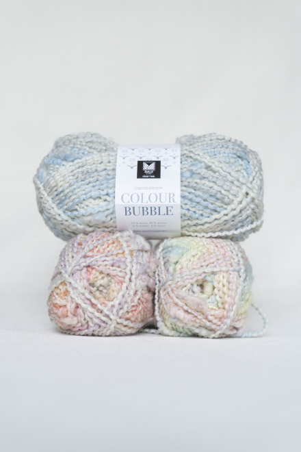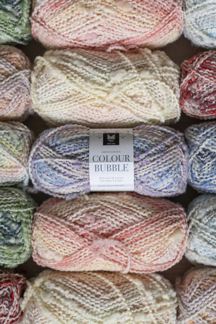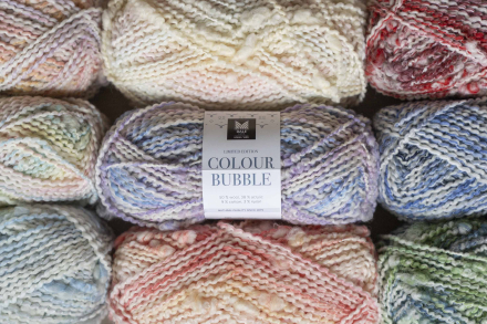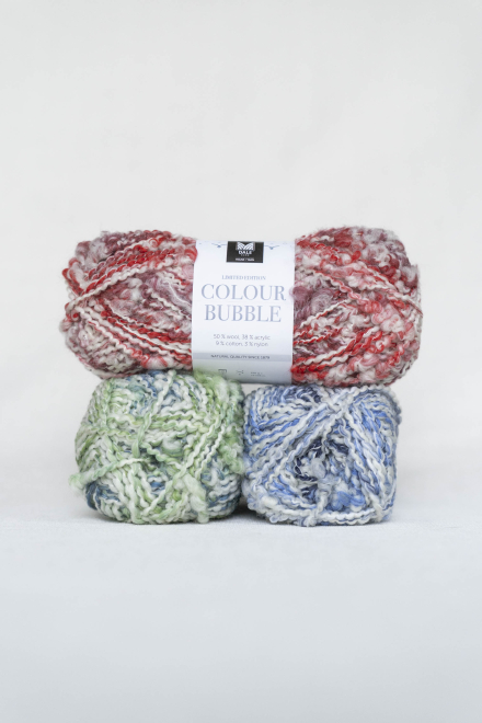 Colour Bubble er et effektgarn til strikning og hækling med selvstribende, lange farveskift. En bølgende tråd med bløde overgange mellem de forskellige farver på nøglerne. Perfekt til alle typer beklædning og tilbehør samt klude og interiør.