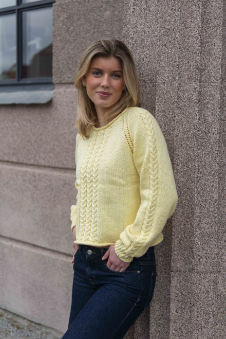 Du kan selv ændre farven på strikkepakken; vælg først den størrelse du vil strikke, så vises udvalget af farver herunder. Bemærk! Strikkeopskriften leveres altid i strikkepakkens originale farver: lys gul