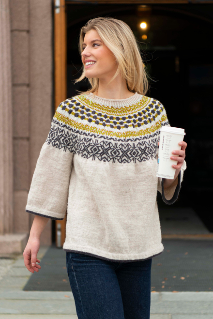 Alle vores strikkepakker indeholder mønster og komplet garnforbrug til ønsket størrelse, såfremt de angivne mål og strikkefasthed overholdes. Strikkepinde, knapper og andet tilbehør købes separat.