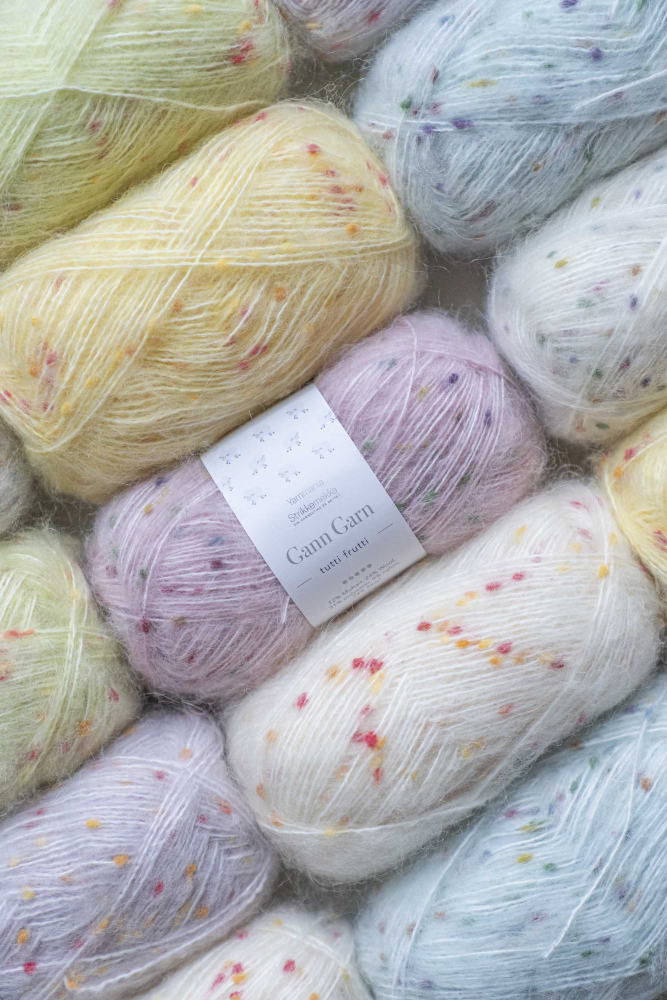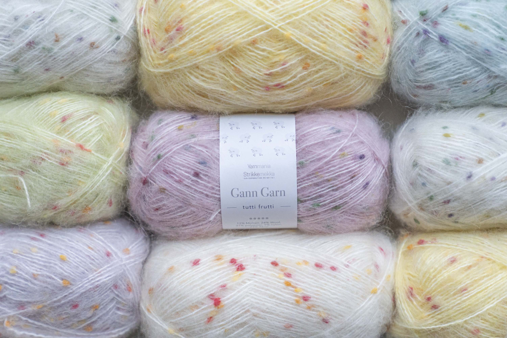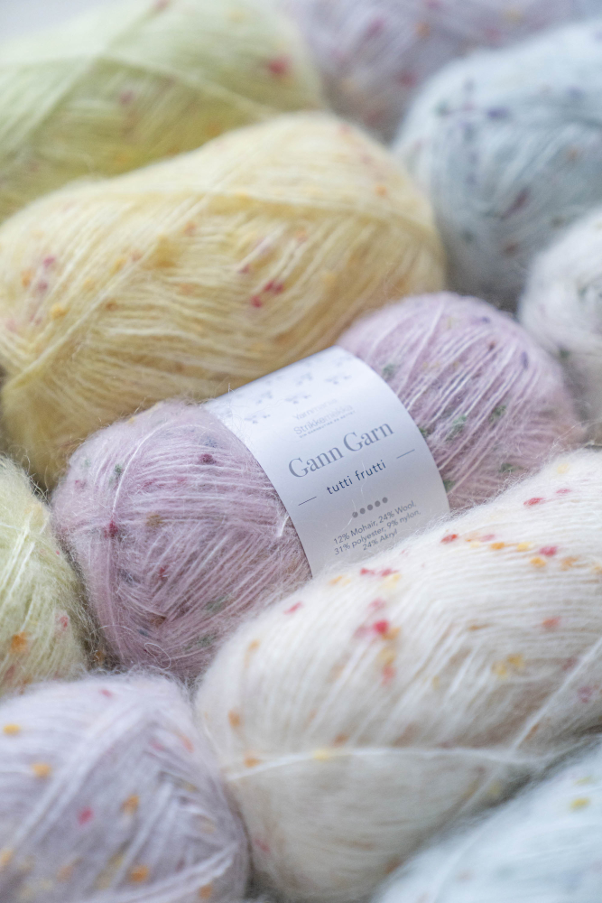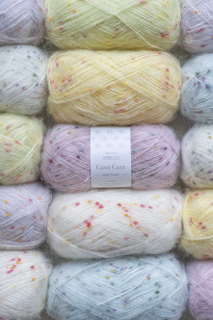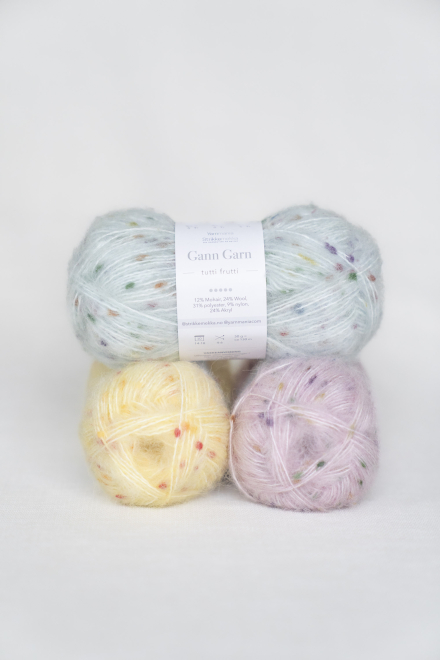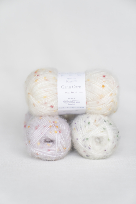 Gann Garn – Tutti Frutti er et spændende og anderledes effektgarn med uendelige muligheder! Det kan strikkes alene med enkelt eller dobbelt tråd, eller bruges som effektgarn sammen med f.eks. Gann Garn Tynn Merino eller Gann Garn Bliss for et helt unikt udtryk. Gann Garn Tutti Frutti er blødt og smidigt, og garnet glider godt på pindene. Garnet er forstærket med både polyester og akryl, sammen med mohair og uld, og er både varmt og slidstærkt.