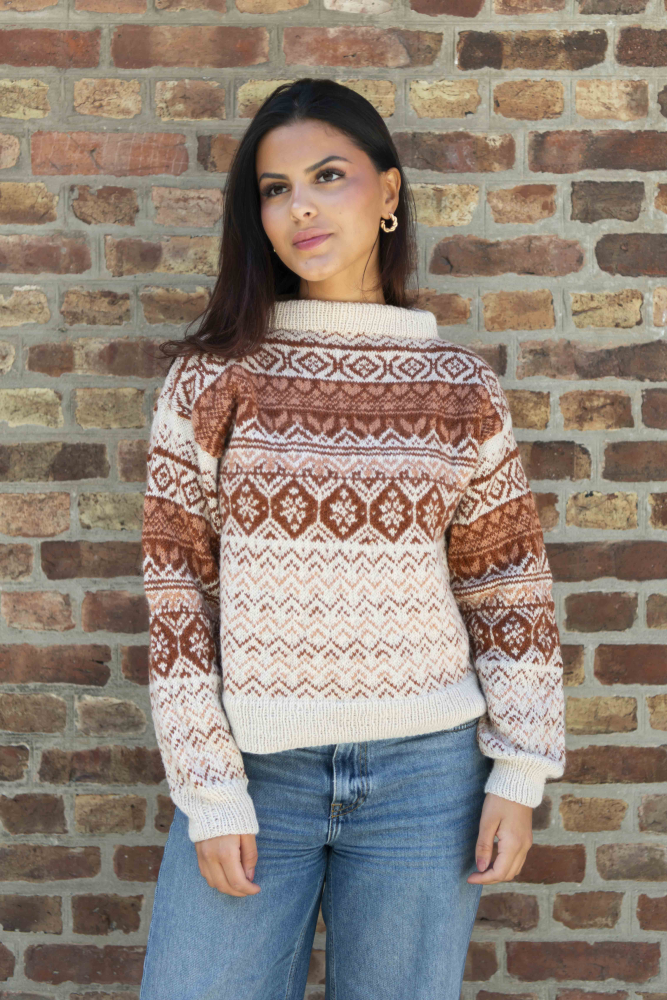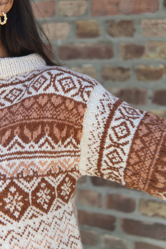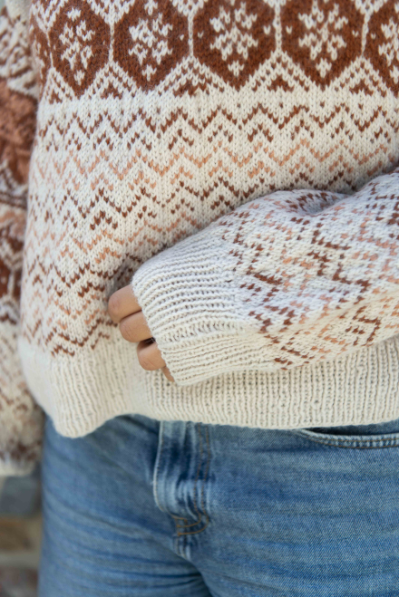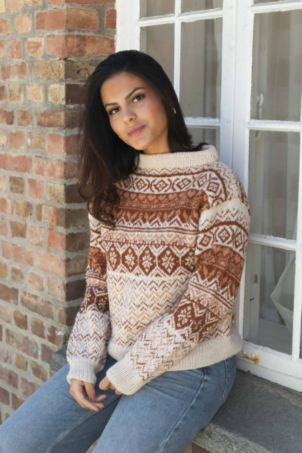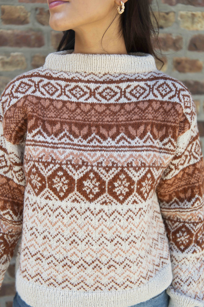 Du kan selv ændre farven på strikkepakken; vælg først den størrelse du vil strikke, så vises udvalget af farver herunder. Bemærk! Strikkeopskriften leveres altid i strikkepakkens originale farve: lys beige meleret, kobber og dus abrikos