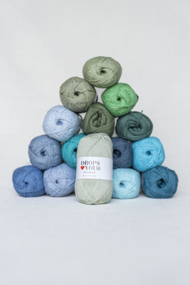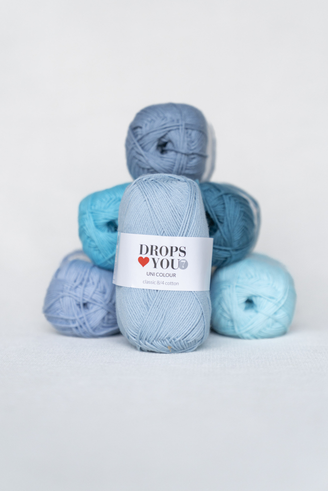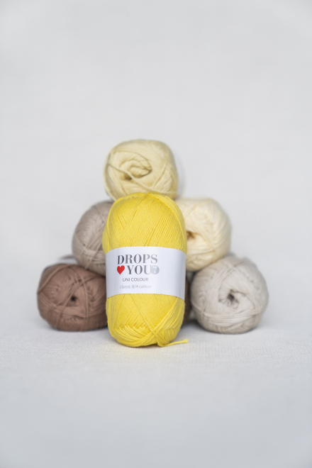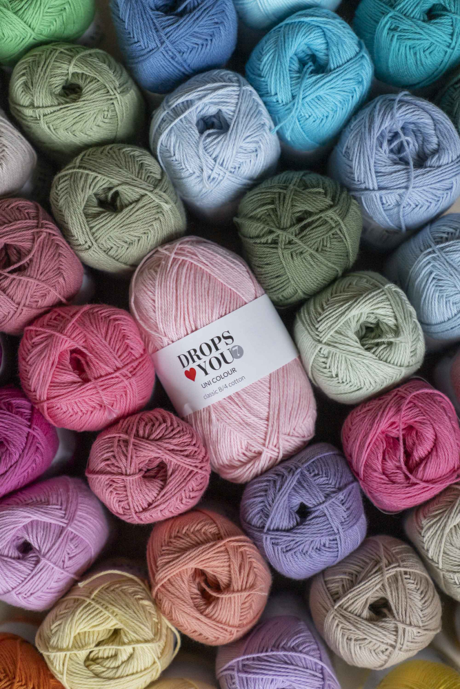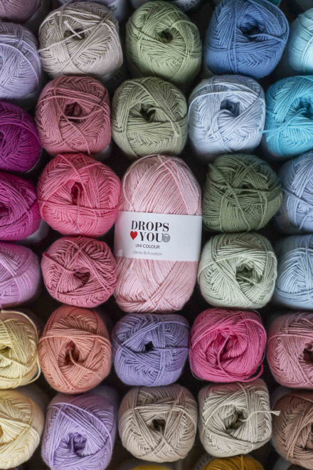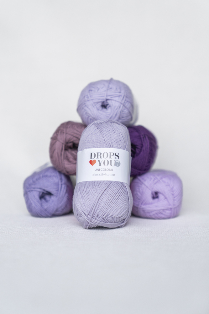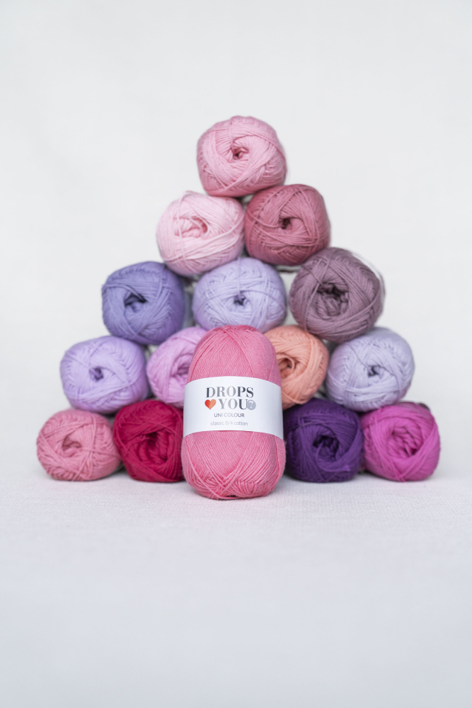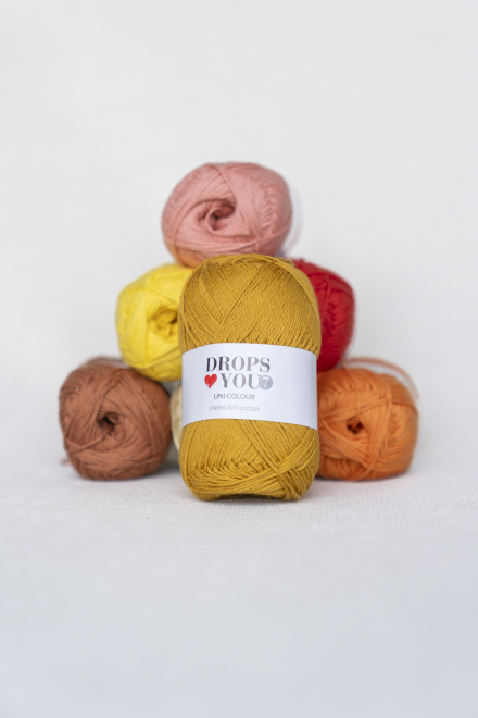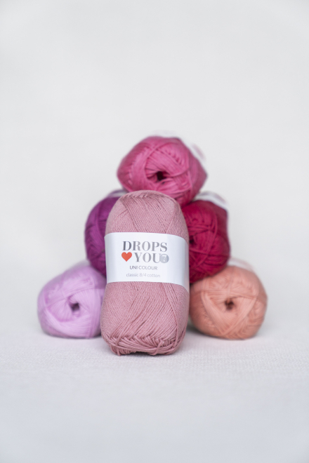DROPS ♥ You #7 er en klassisk 8/4-kvalitet i ren bomuld. Skønne farver, der er perfekte at lege med, og de kan kombineres på uendelige måder – garnet er billigt og et perfekt valg til større interiørprojekter, såsom tæpper, måtter og puder. Det passer selvfølgelig også til andre typer projekter som sommertøj, tilbehør og søde små legetøj til børnene. DROPS ♥ You-garnet kan maskinvaskes, hvilket gør det velegnet til hverdagsbrug – og til børnetøj!