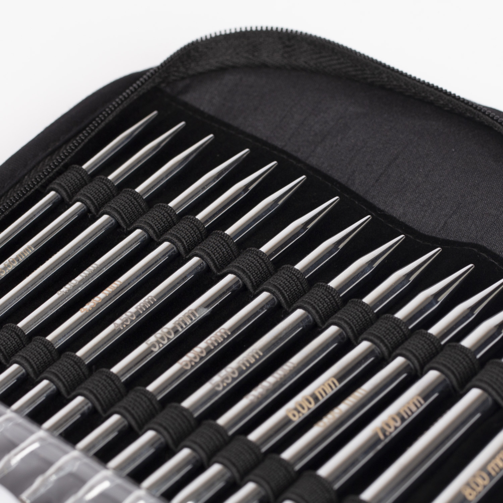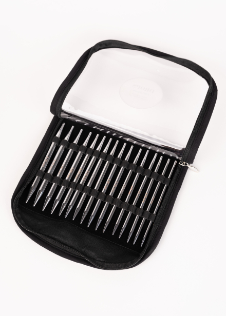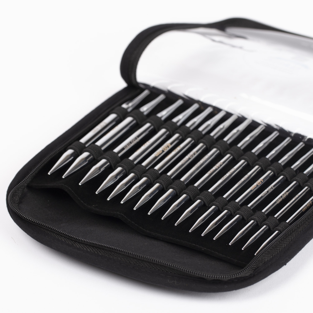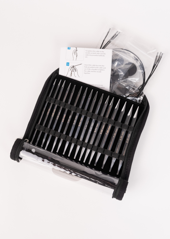 Tag din strikning med dig overalt med dette udskiftelige rundpindesæt i messing og nikkel. Tekstiletuiet med transparent vinylforside indeholder 8 par rundpindespidser i størrelserne 3,5, 4,0, 4,5, 5,0, 5,5, 6,0, 7,0 og 8,0 mm, 4 kabler i 60, 80 (x2) og 100 cm med stoppere og instruktioner.