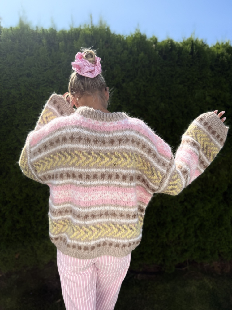 Du kan selv ændre farven på strikkepakken; vælg først den størrelse du vil strikke, så vises udvalget af farver herunder. Bemærk! Strikkeopskriften leveres altid i strikkepakkens originale farver: beige, hvid, lys gul, lyserød, kamel og pink/brown mix