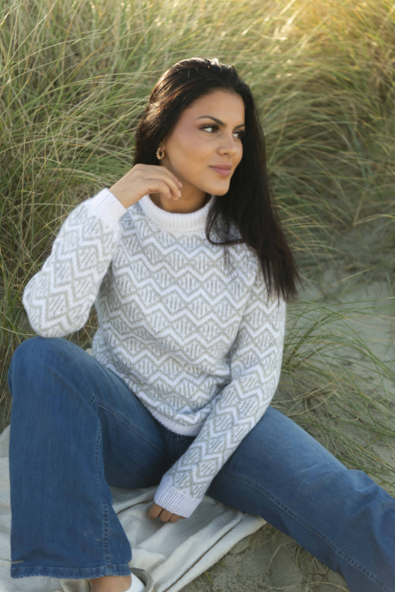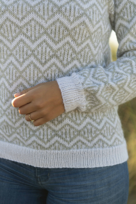 Du kan selv ændre farven på strikkepakken; vælg først den størrelse du vil strikke, så vises udvalget af farver herunder. Bemærk! Strikkeopskriften leveres altid i strikkepakkens originale farve: hvid og lysgrå meleret