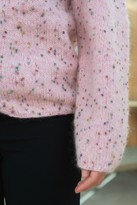 Du kan selv ændre farven på strikkepakken; vælg først den størrelse du vil strikke, så vises udvalget af farver herunder. Bemærk! Strikkeopskriften leveres altid i strikkepakkens originale farver: rosa tåge og lys rosa