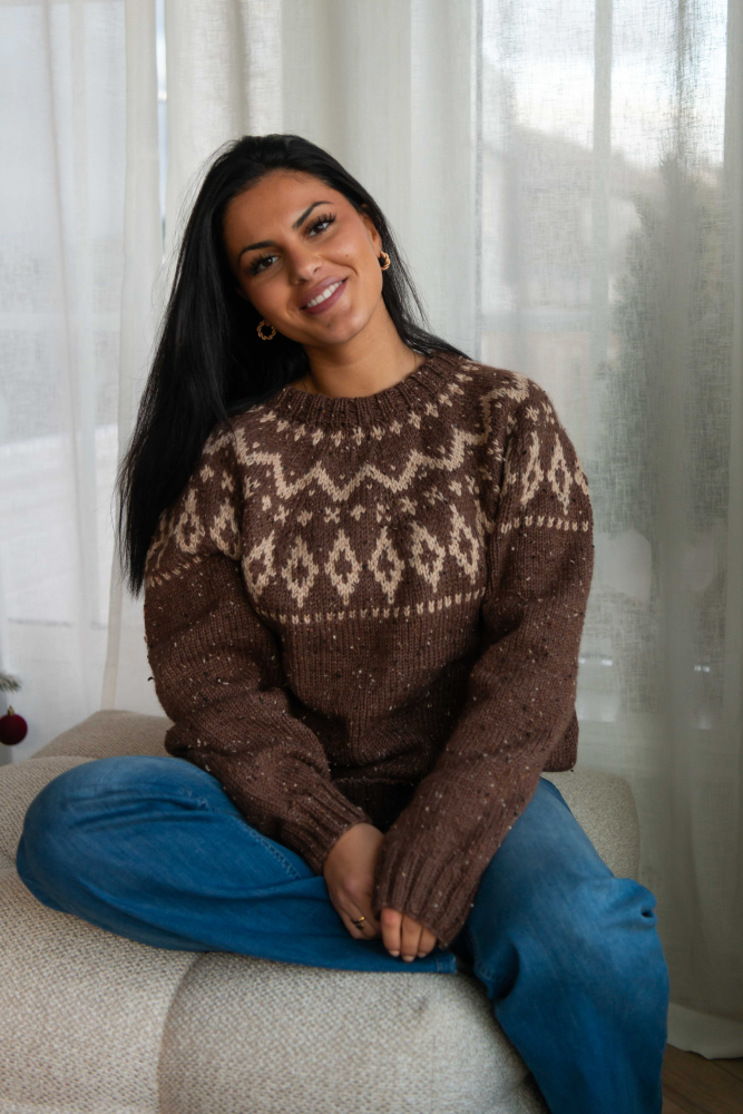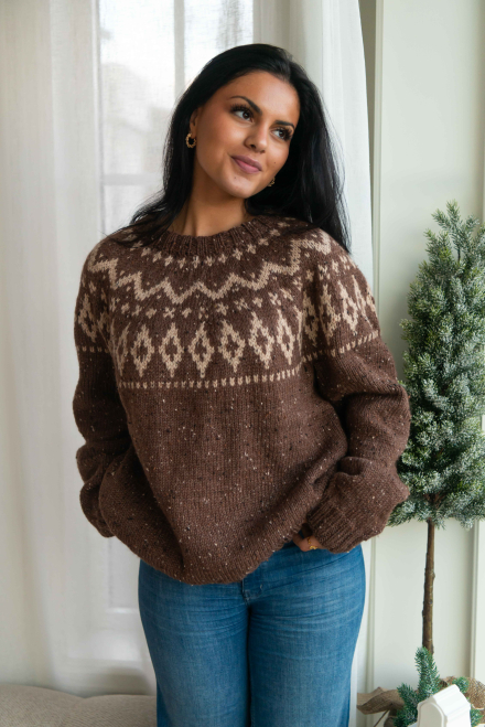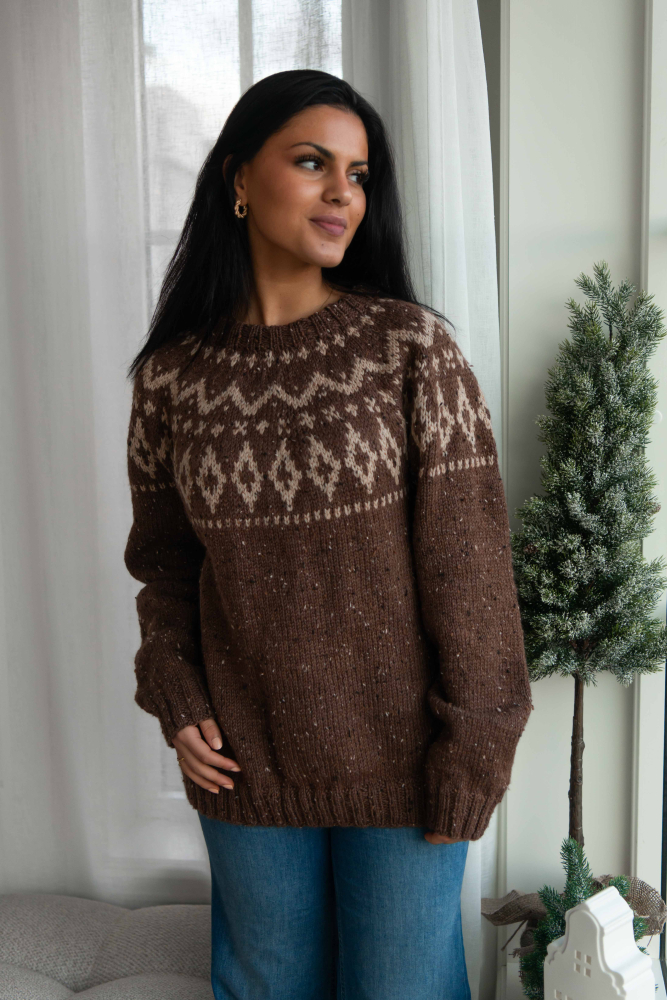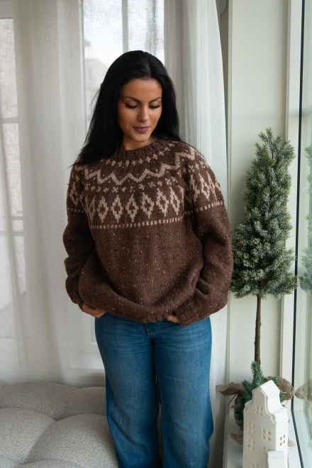 Du kan selv ændre farven på strikkepakken; vælg først den størrelse du vil strikke, så vises udvalget af farver herunder. Bemærk! Strikkeopskriften leveres altid i strikkepakkens originale farver: brun og lys beige