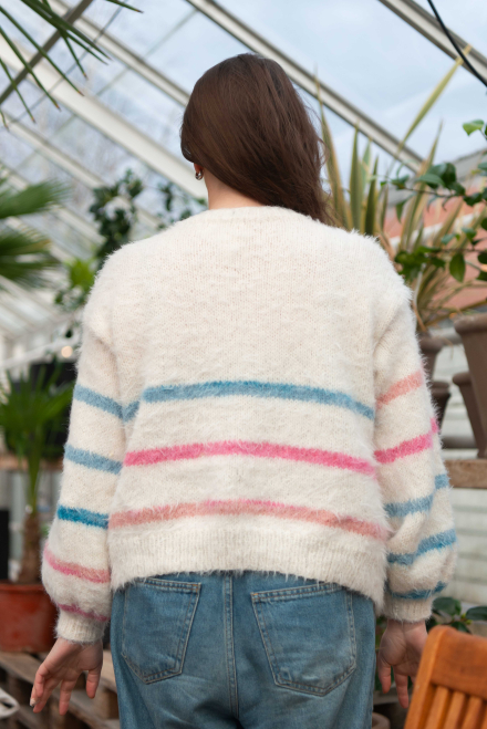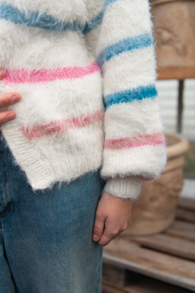Du kan selv ændre farven på strikkepakken; vælg først den størrelse du vil strikke, så vises udvalget af farver herunder. Bemærk! Strikkeopskriften leveres altid i strikkepakkens originale farver: hvid og rosa/hvid/blå