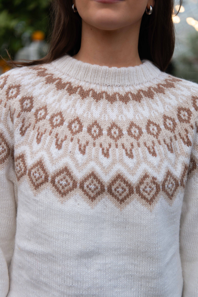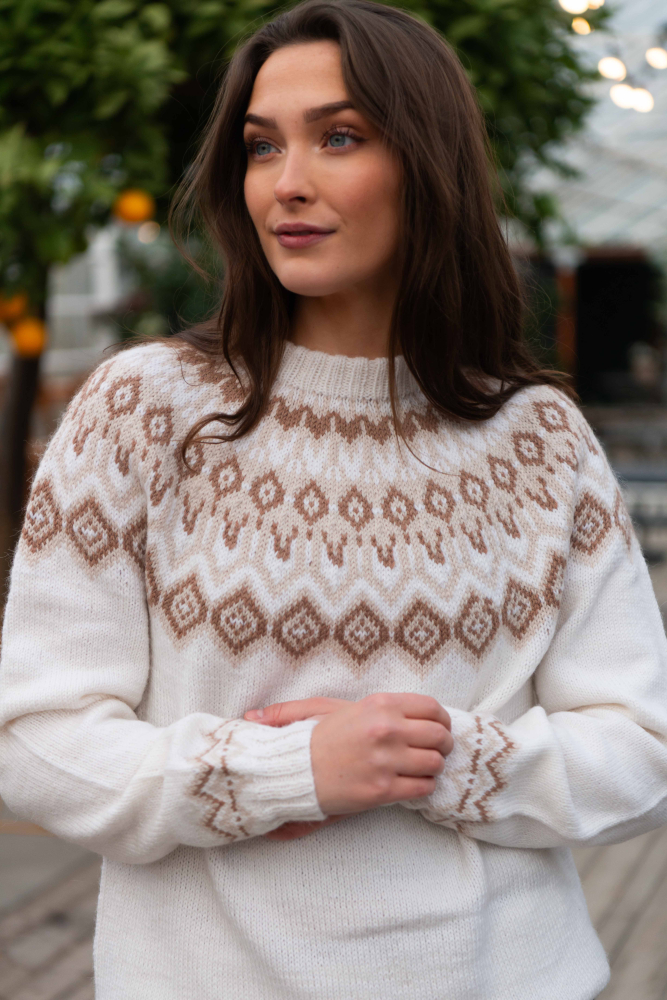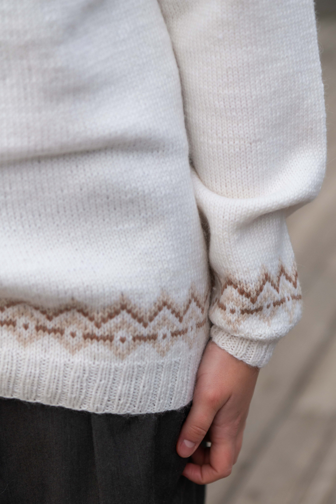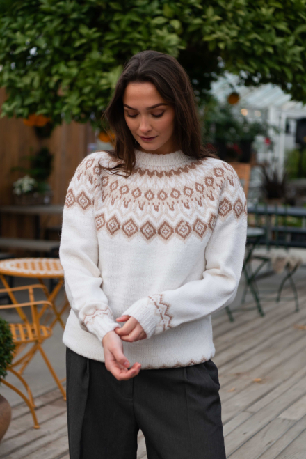 Du kan selv ændre farven på strikkepakken; vælg først den størrelse du vil strikke, så vises udvalget af farver herunder. Bemærk! Strikkeopskriften leveres altid i strikkepakkens originale farver: offwhite, lys beige meleret og mocca mousse
