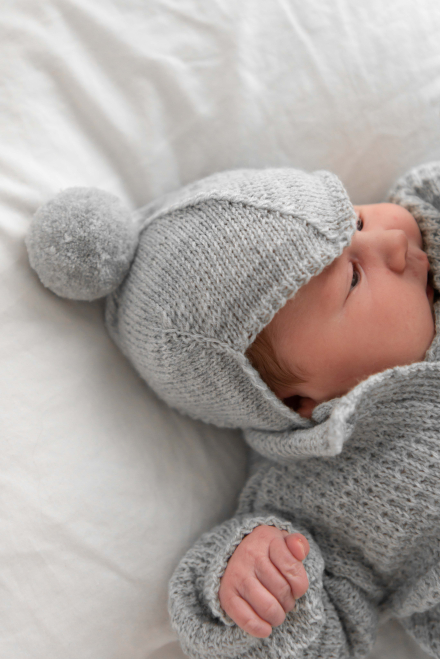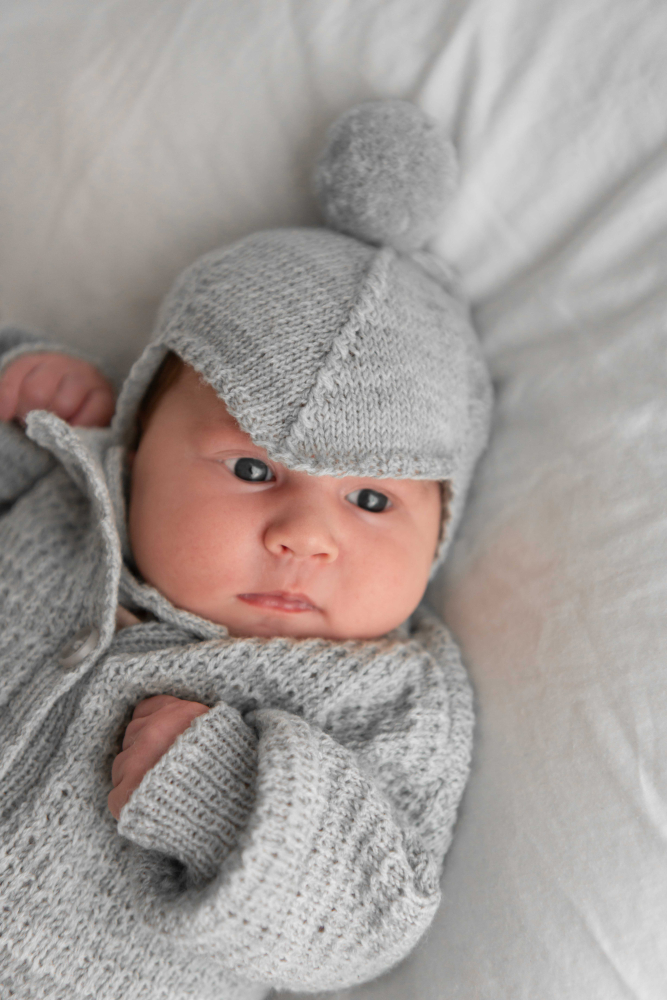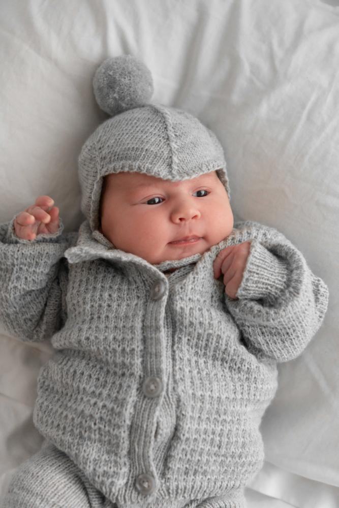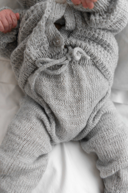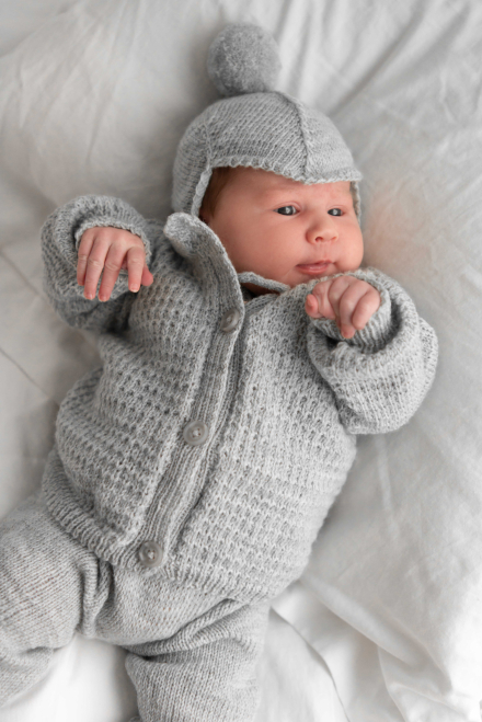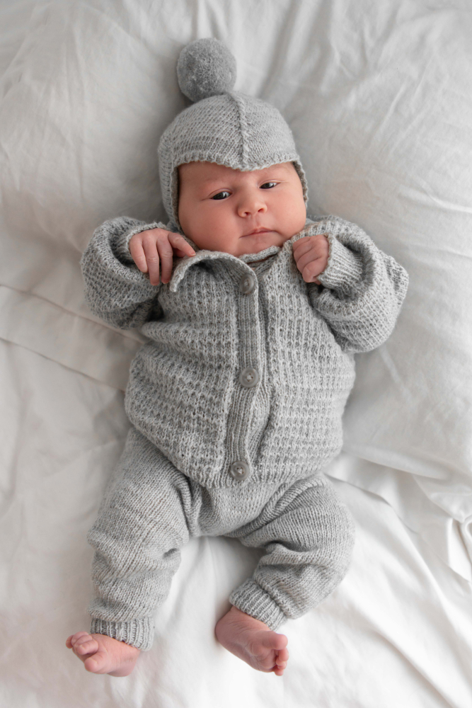 Cardigan med strukturmønster, og glatstrikket buks og hue.