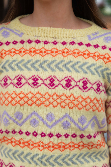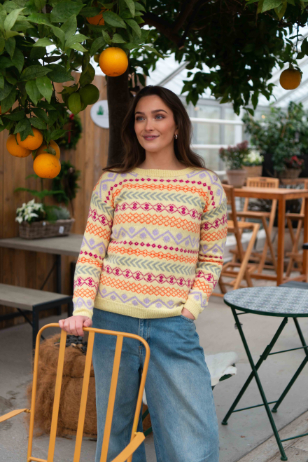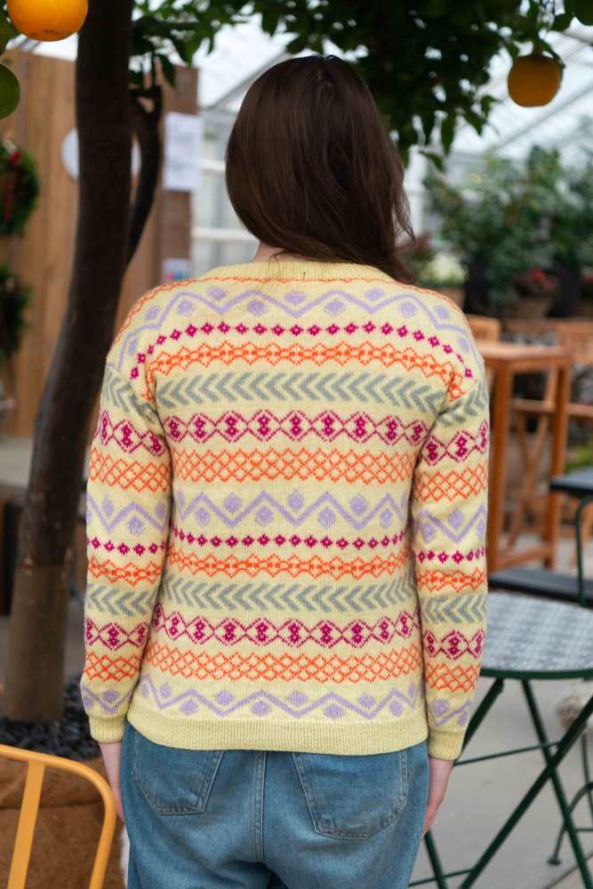 Du kan selv ændre farven på strikkepakken; vælg først den størrelse du vil strikke, så vises udvalget af farver herunder. Bemærk! Strikkeopskriften leveres altid i strikkepakkens originale farver: lys gul, bleg lilla, orange, pink og mineralgrå.