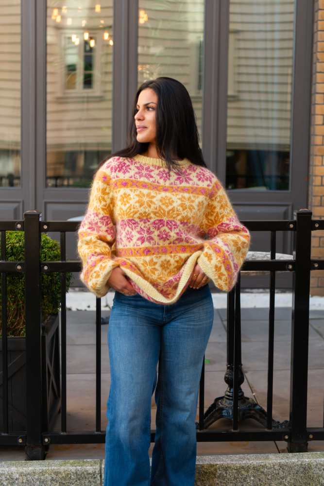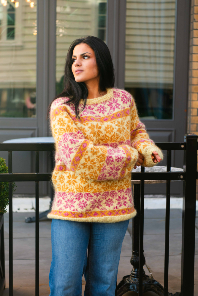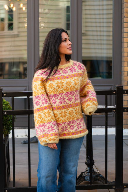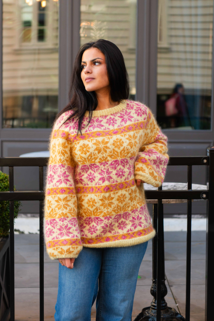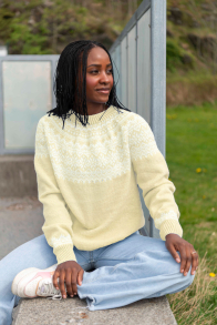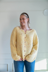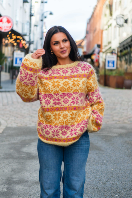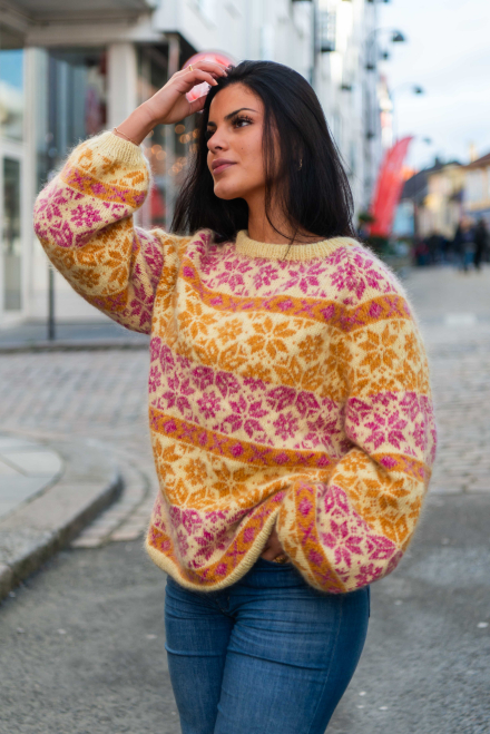 Du kan selv ændre farven på strikkepakken; vælg først den størrelse du vil strikke, så vises udvalget af farver herunder. Bemærk! Strikkeopskriften leveres altid i strikkepakkens originale farver: lys gul, pink, honninggul, vanilje, koral og gul