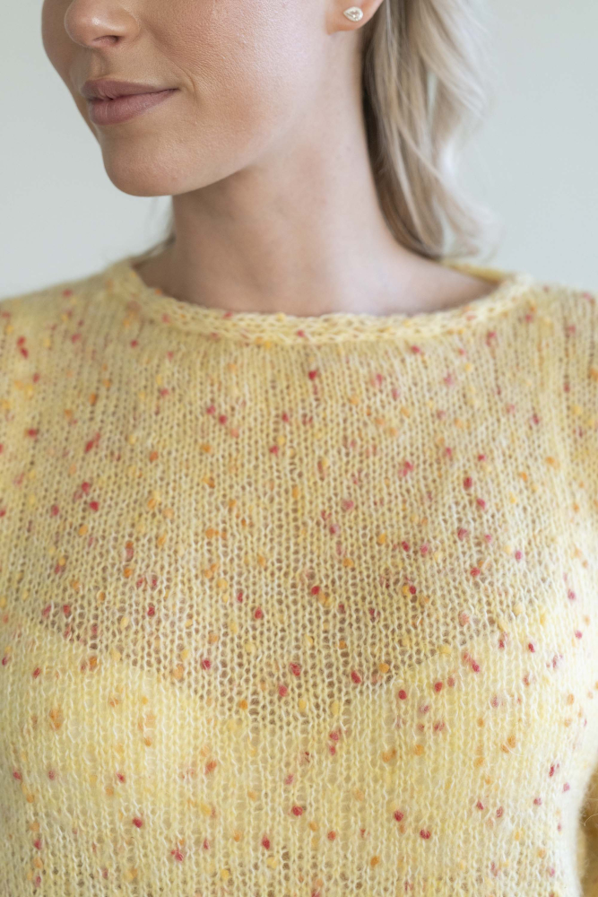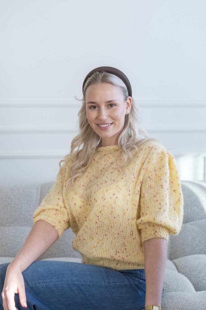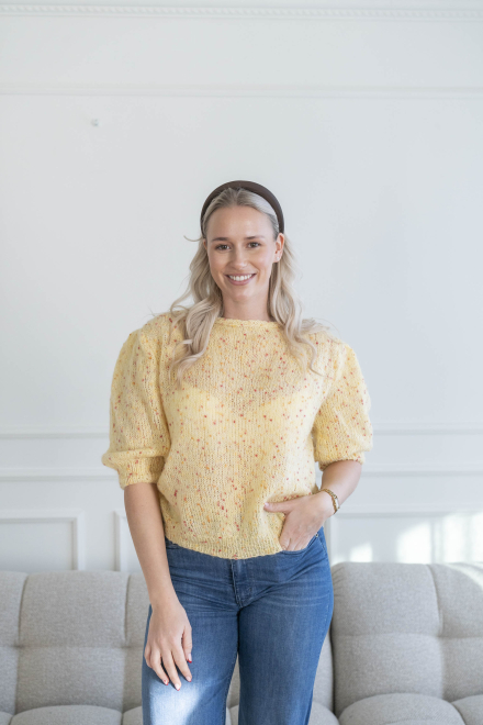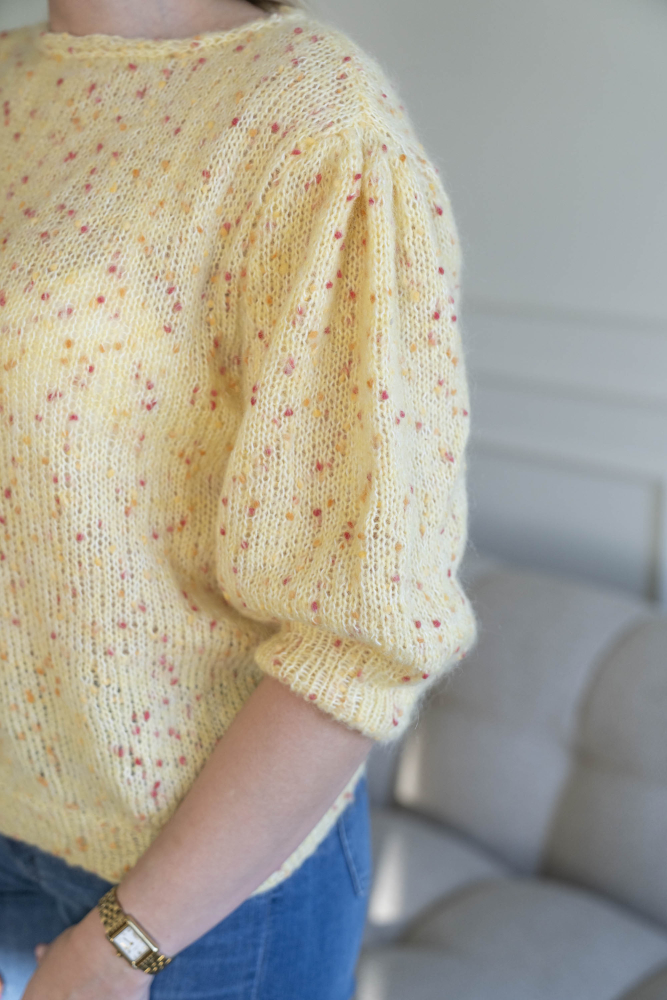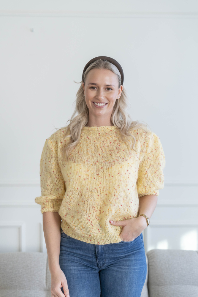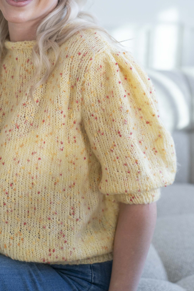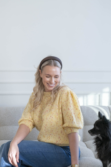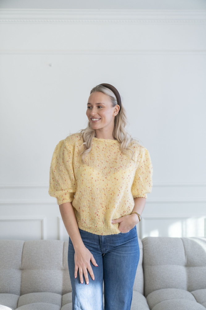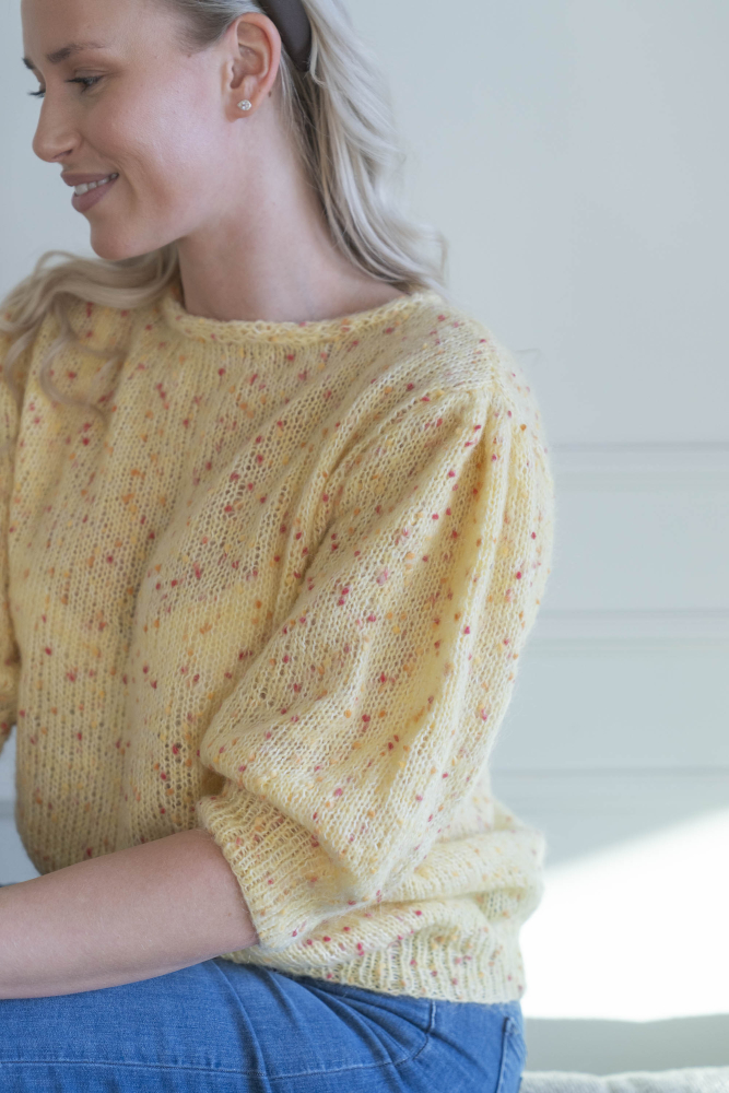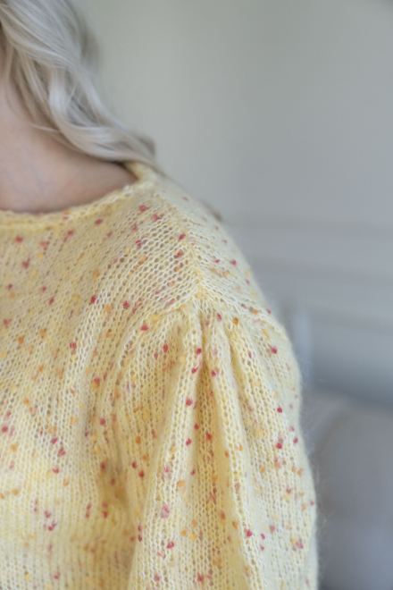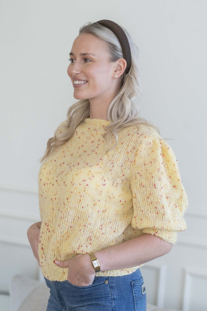 Du kan selv ændre farven på strikkepakken; vælg først den størrelse du vil strikke, så vises udvalget af farver herunder. Bemærk! Strikkeopskriften leveres altid i strikkepakkens originale farver: smørblomst