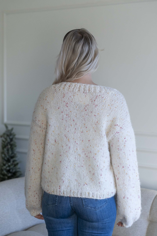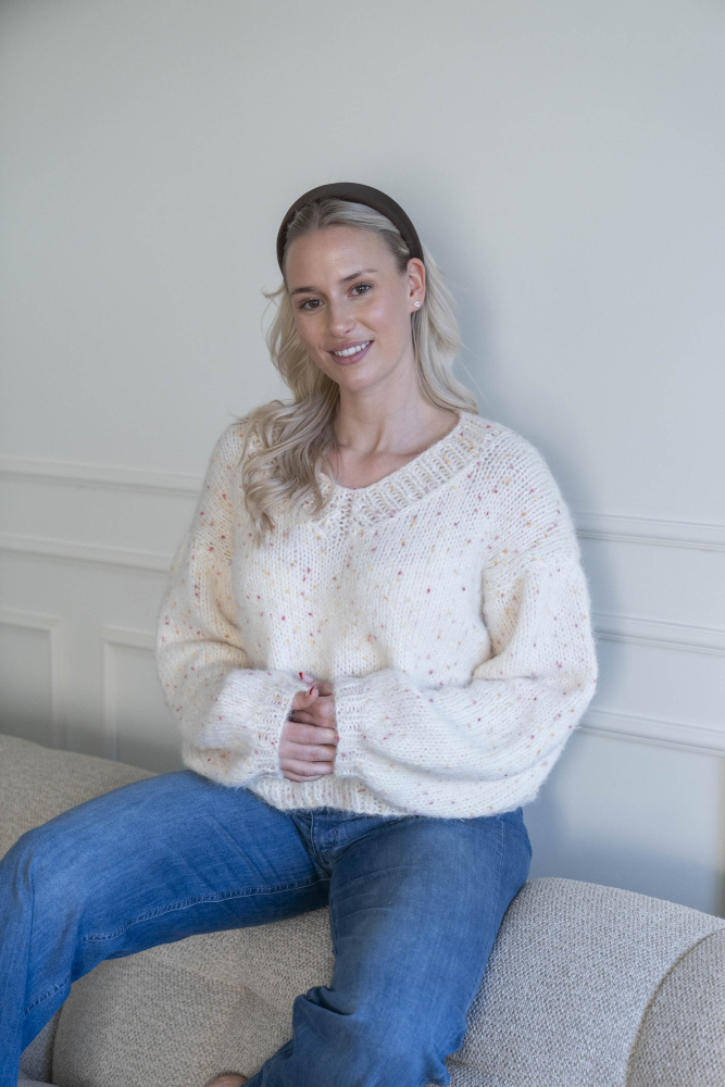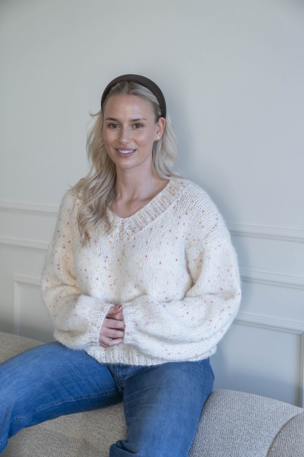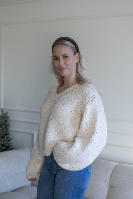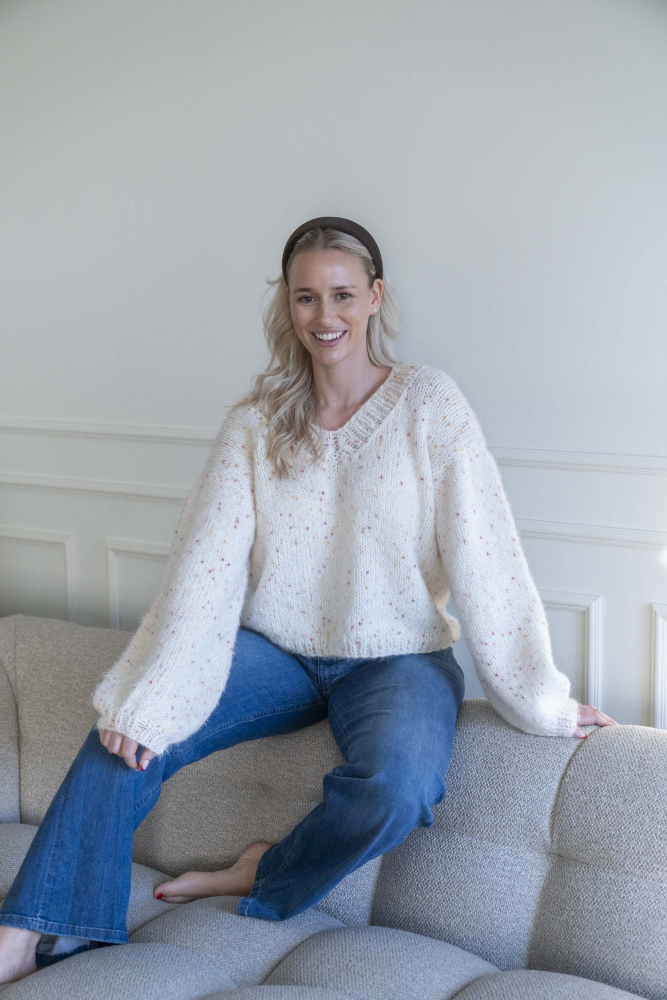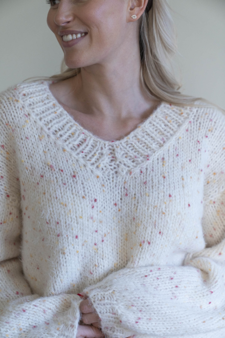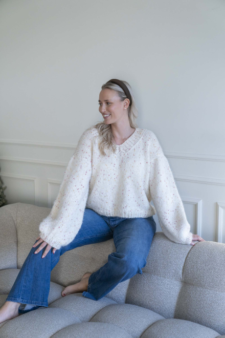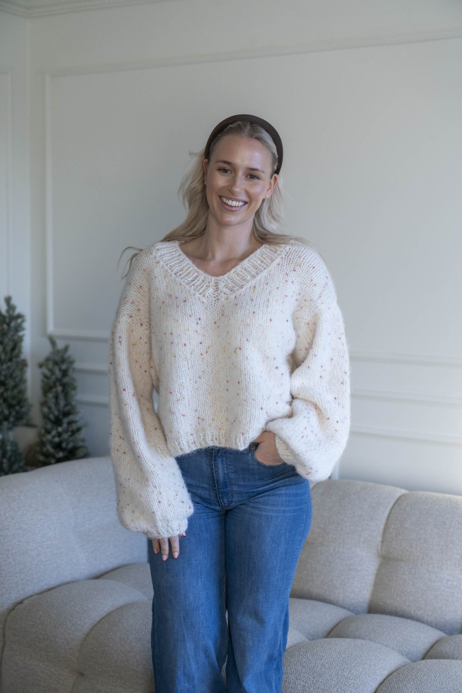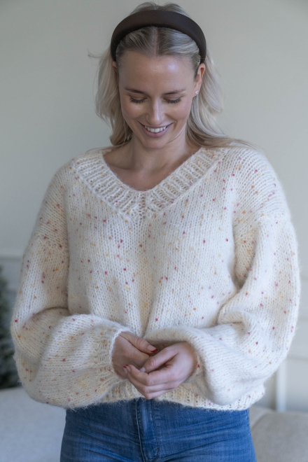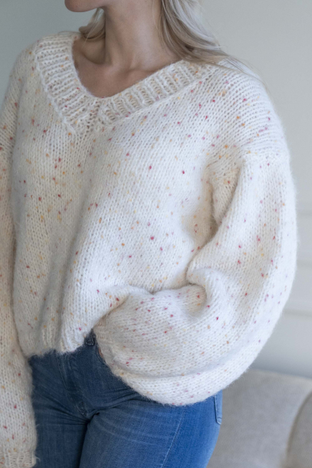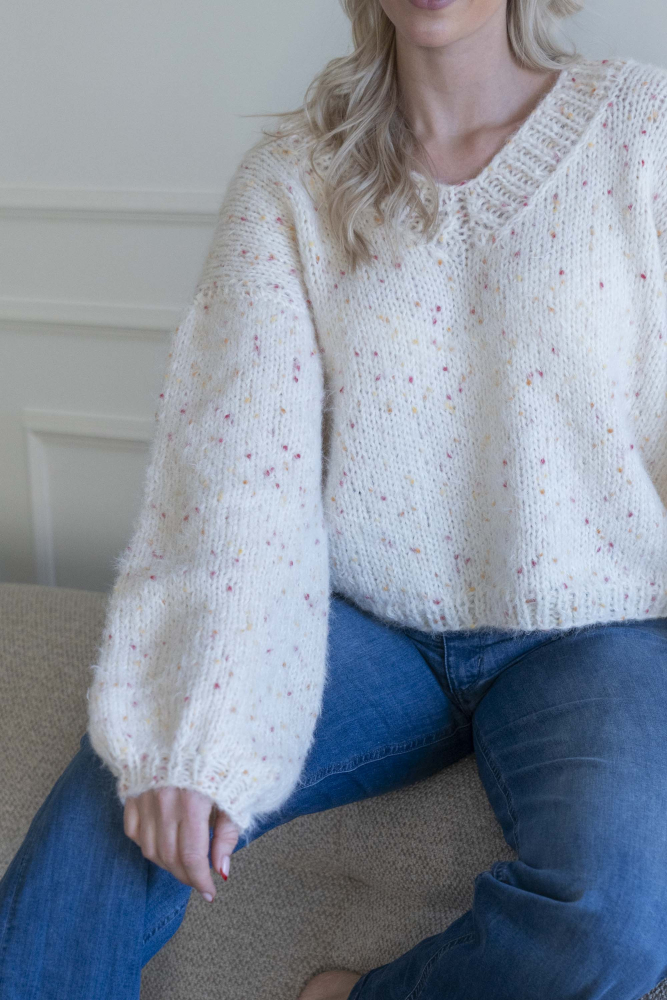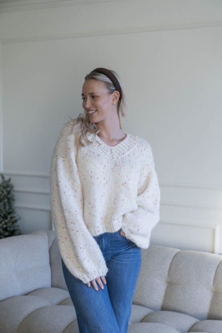 Oversized, kort, trendy V-trøje, strikket i dobbelt garn med påsatte ærmer uden maskinsømme.