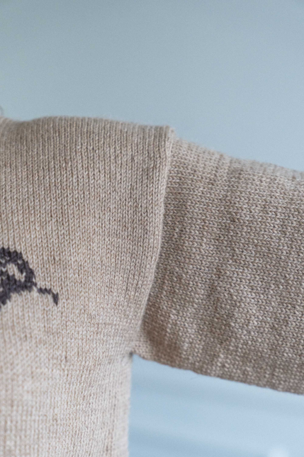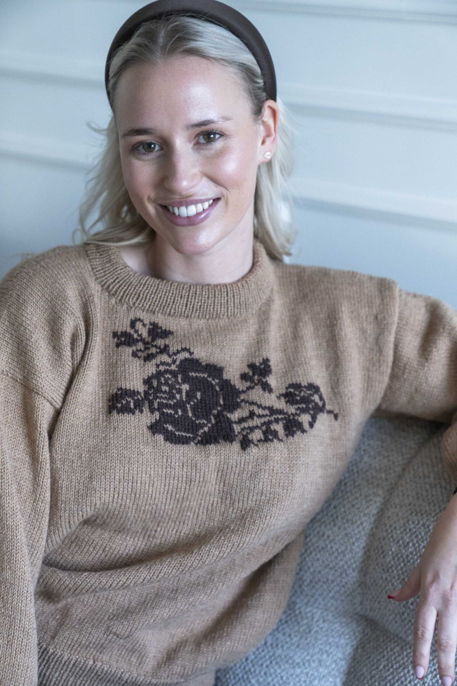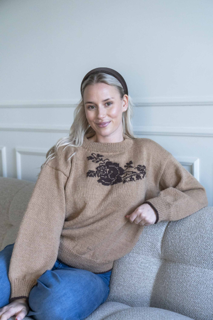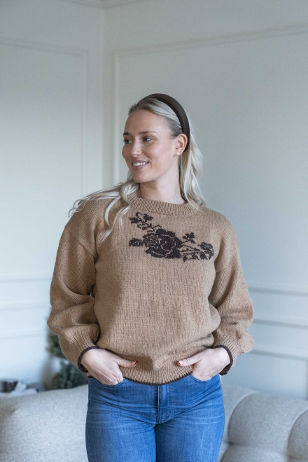 Enkel sweater med motiv af rose foran, som strikkes ind med intarsiastrik eller sys på med maskesting til sidst.