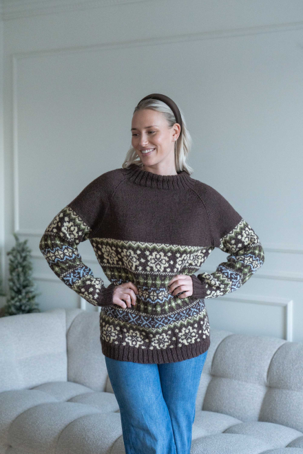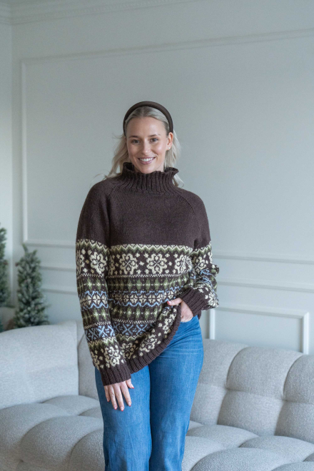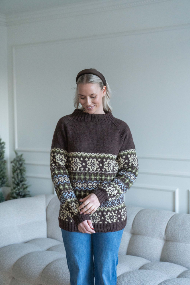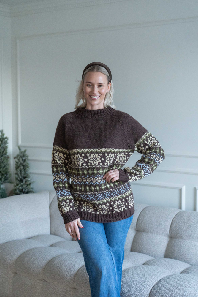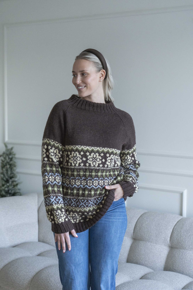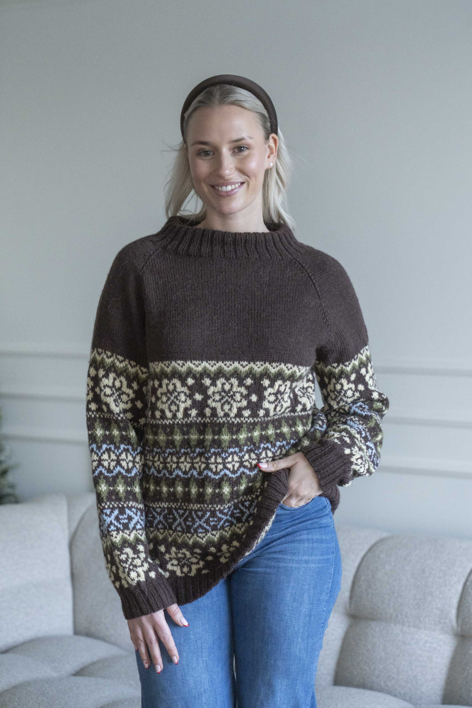 Du kan selv ændre farven på strikkepakken; vælg først den størrelse du vil strikke, så vises udvalget af farver herunder. Bemærk! Strikkeopskriften leveres altid i strikkepakkens originale farver: brun, vanilje, grøn og lyseblå
