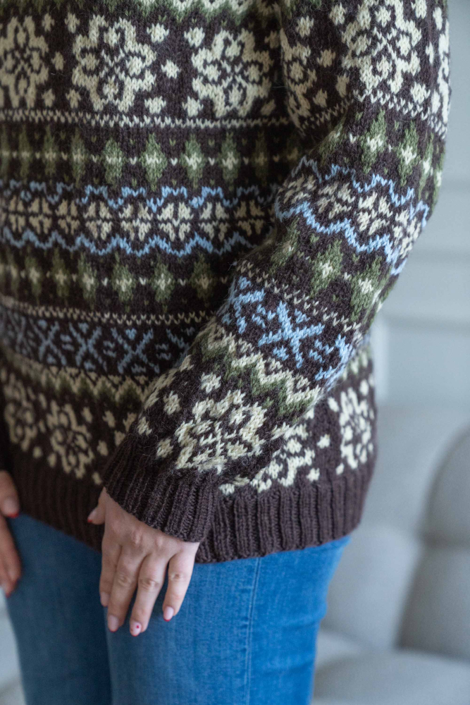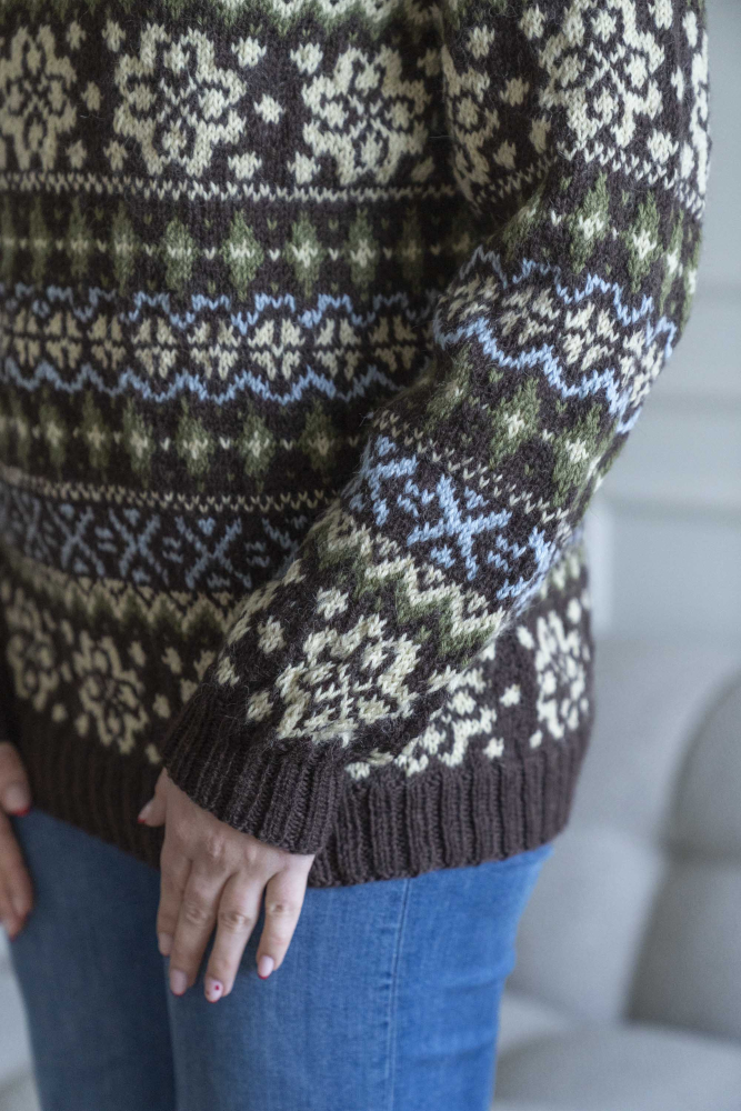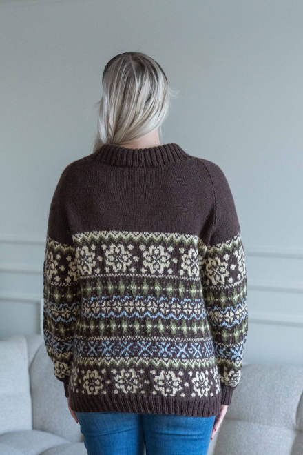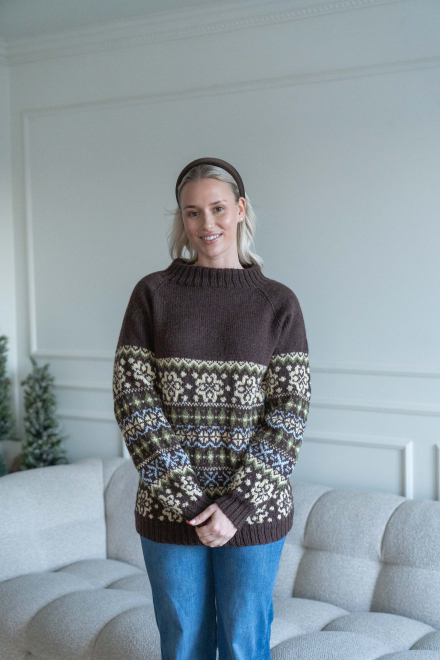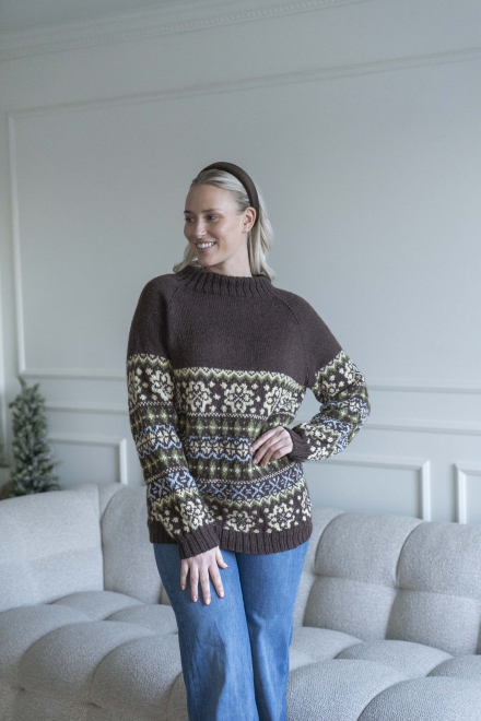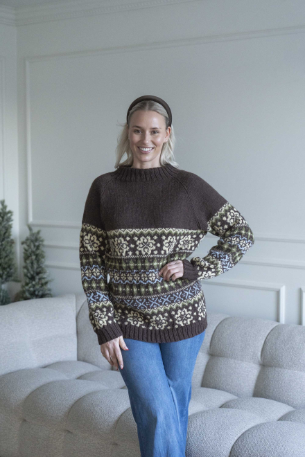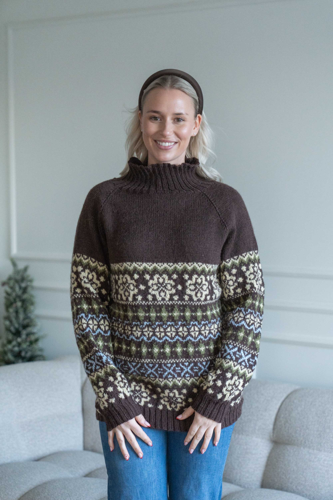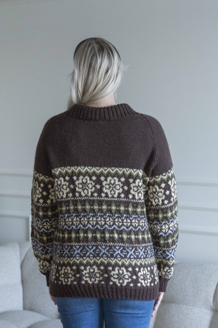 Du kan selv ændre farven på strikkepakken; vælg først den størrelse du vil strikke, så vises udvalget af farver herunder. Bemærk! Strikkeopskriften leveres altid i strikkepakkens originale farver: brun, vanilje, grøn og lyseblå