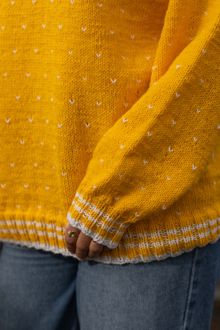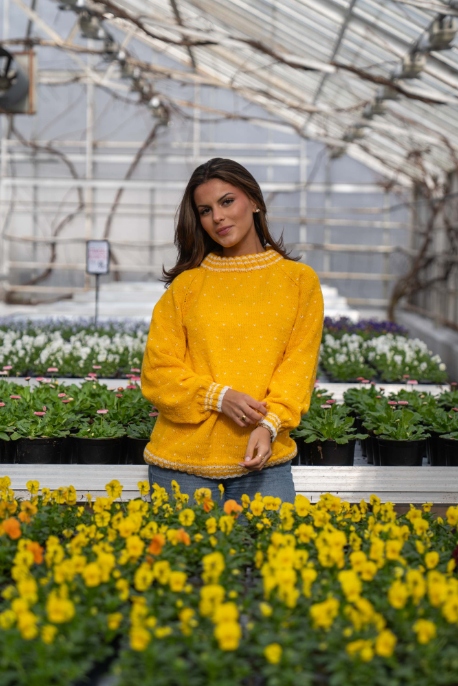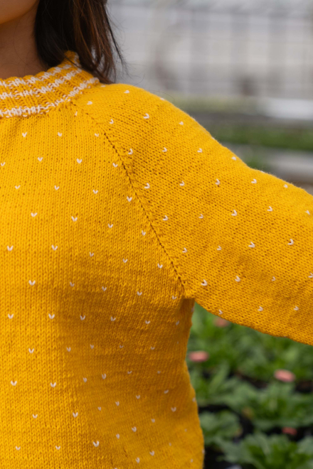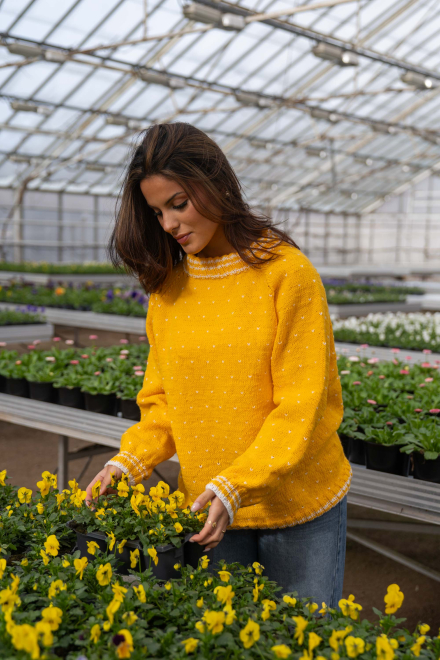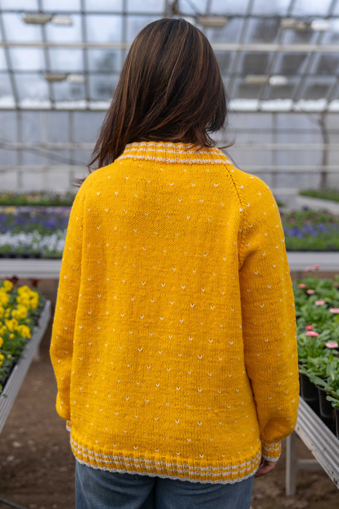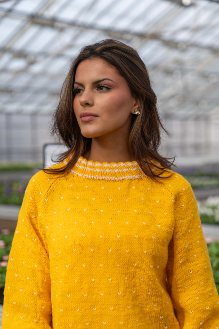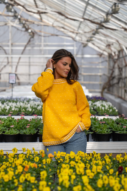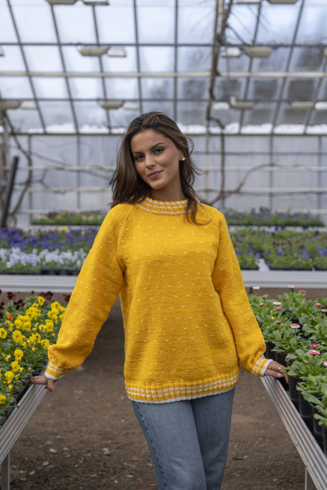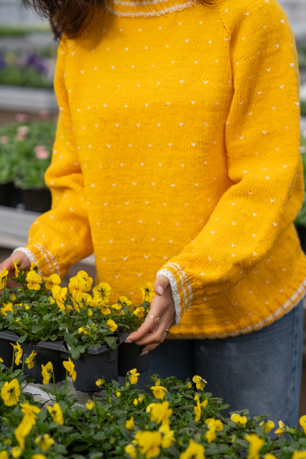 Du kan selv ændre farven på strikkepakken; vælg først den størrelse du vil strikke, så vises udvalget af farver herunder. Bemærk! Strikkeopskriften leveres altid i strikkepakkens originale farver: solsikke og hvid