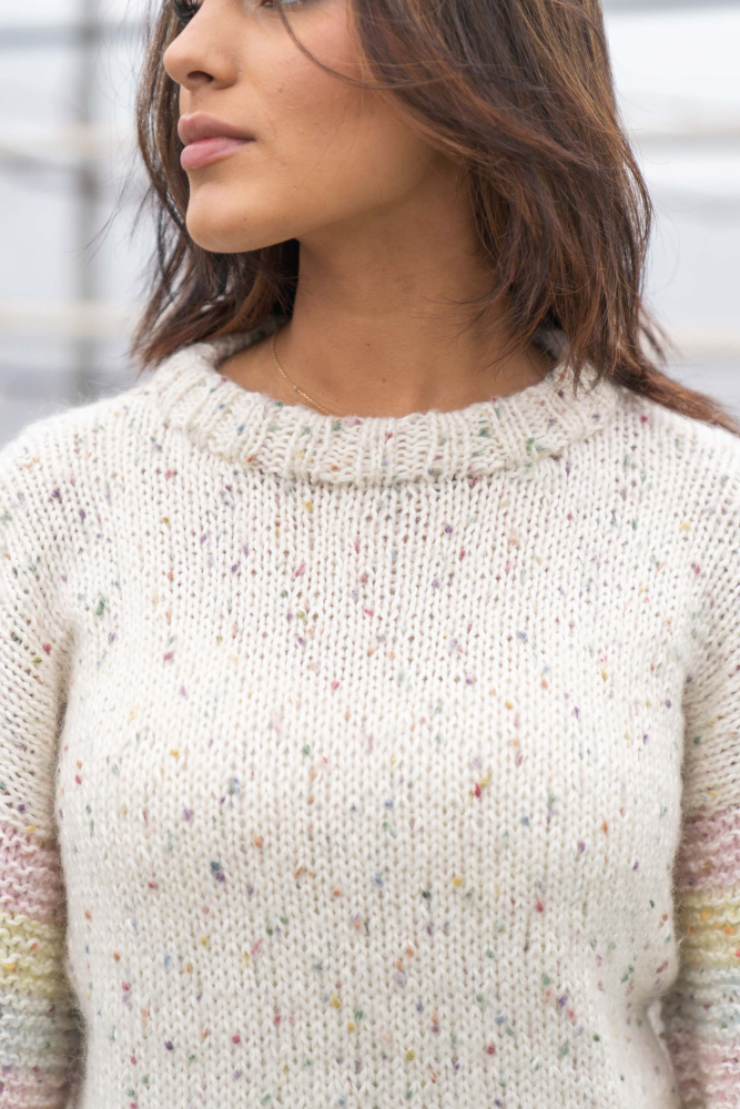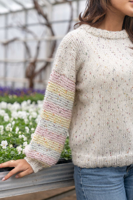 Du kan selv ændre farven på strikkepakken; vælg først den størrelse du vil strikke, så vises udvalget af farver herunder. Bemærk! Strikkeopskriften leveres altid i strikkepakkens originale farver: natur, ecru, orkidé, limegrøn og himmelblå