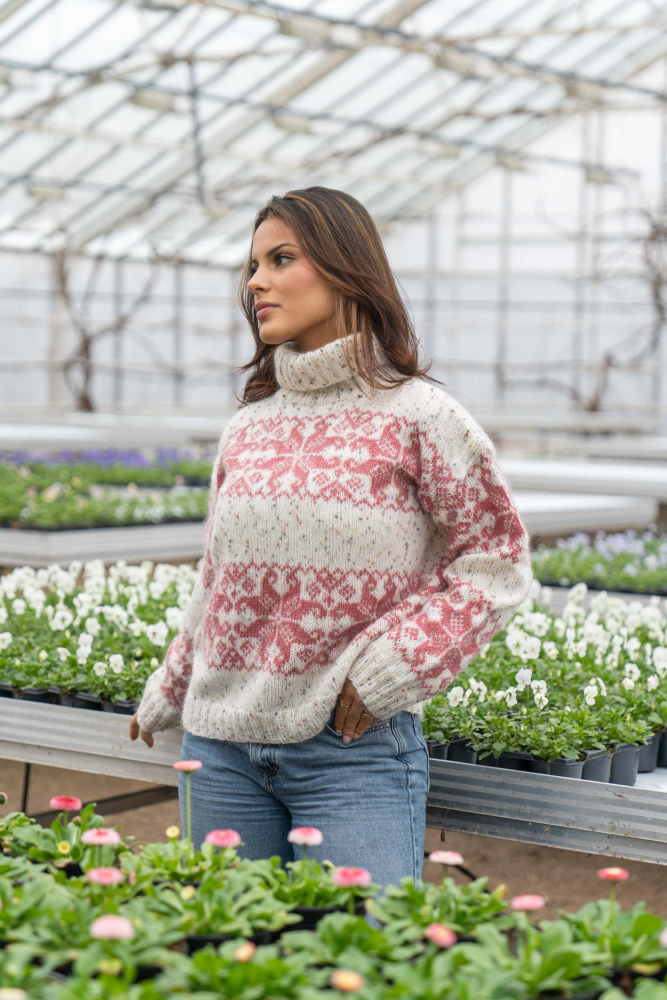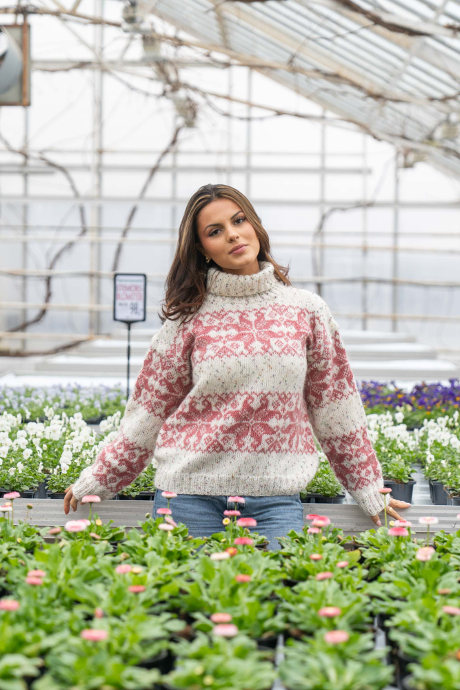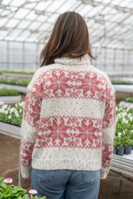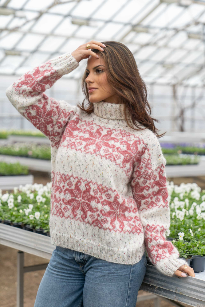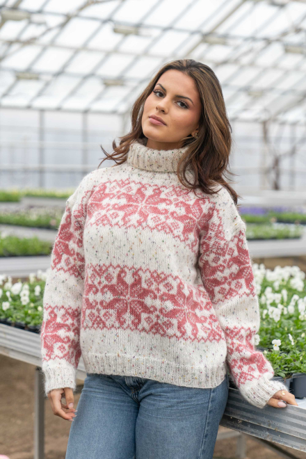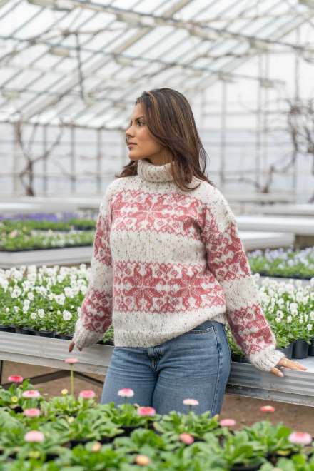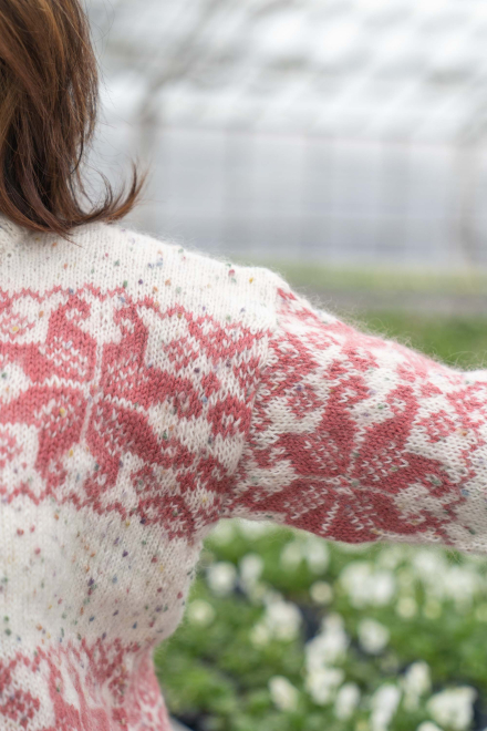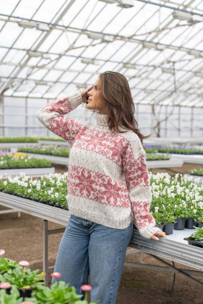 Du kan selv ændre farven på strikkepakken; vælg først den størrelse du vil strikke, så vises udvalget af farver herunder. Bemærk! Strikkeopskriften leveres altid i strikkepakkens originale farver: ecru, natur, hindbærsorbet og lys hindbær