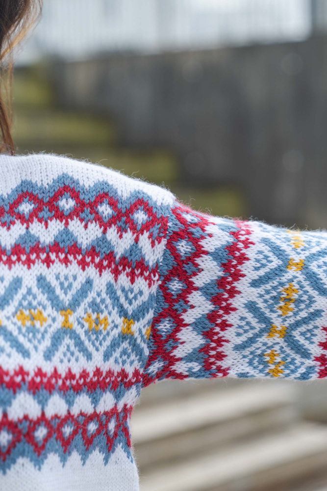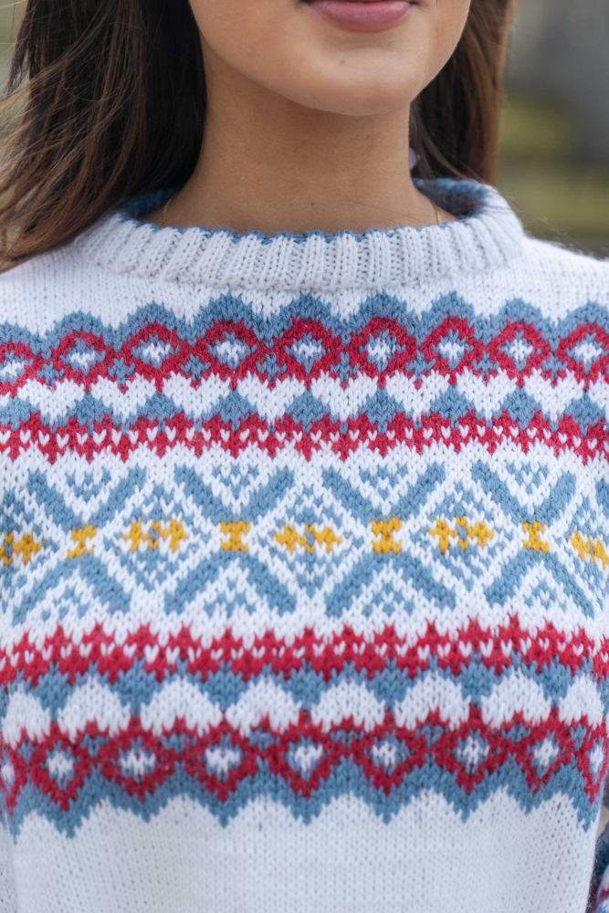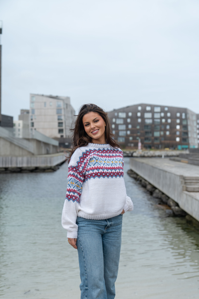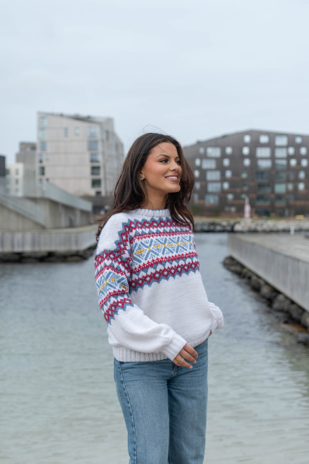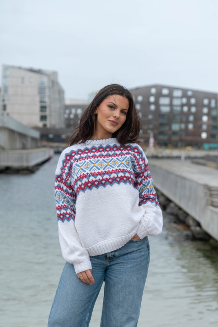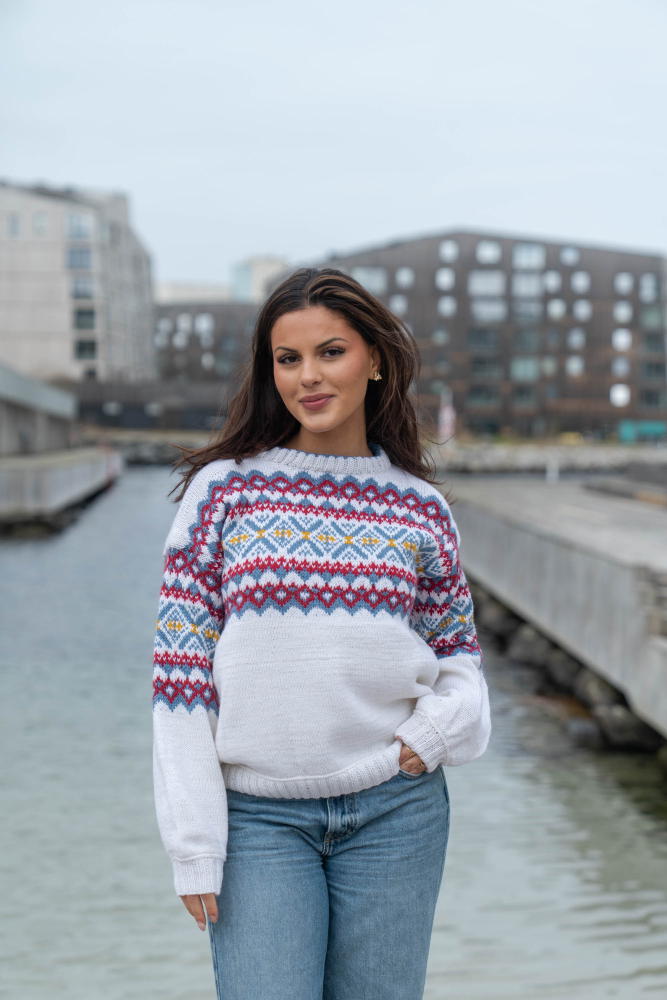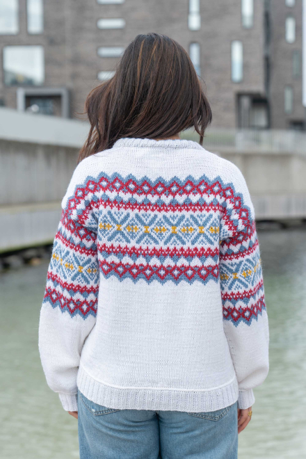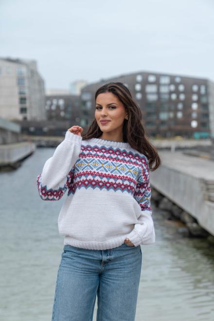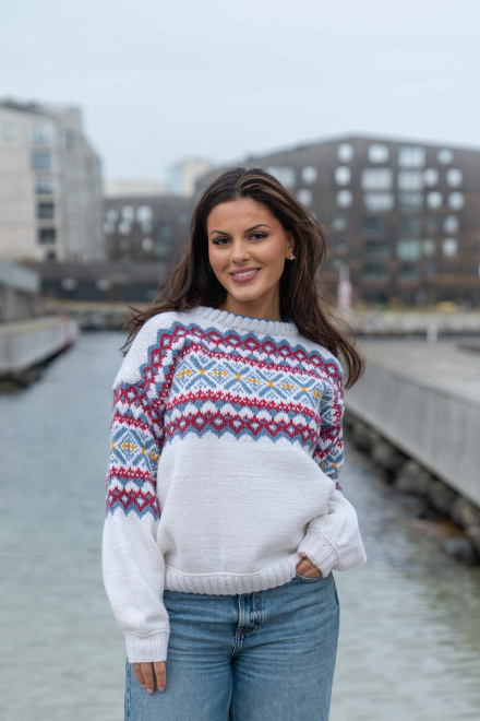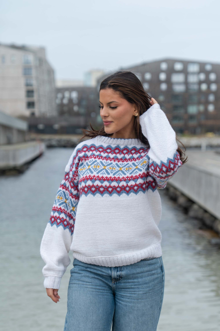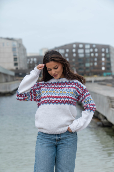 Du kan selv ændre farven på strikkepakken; vælg først den størrelse du vil strikke, så vises udvalget af farver herunder. Bemærk! Strikkeopskriften leveres altid i strikkepakkens originale farver: hvid, denim, dyb rød og solsikke