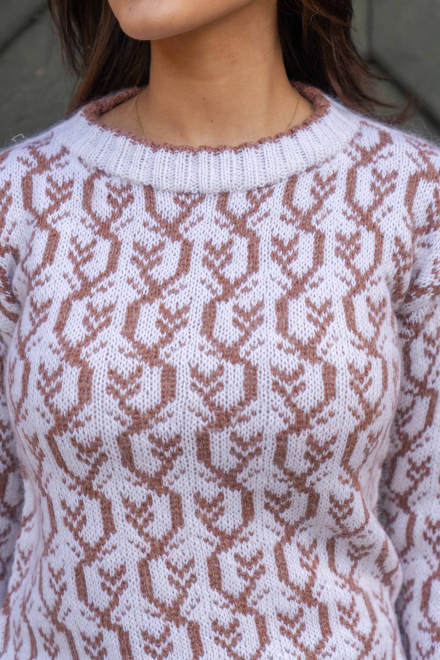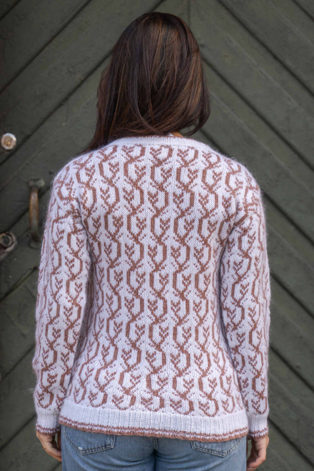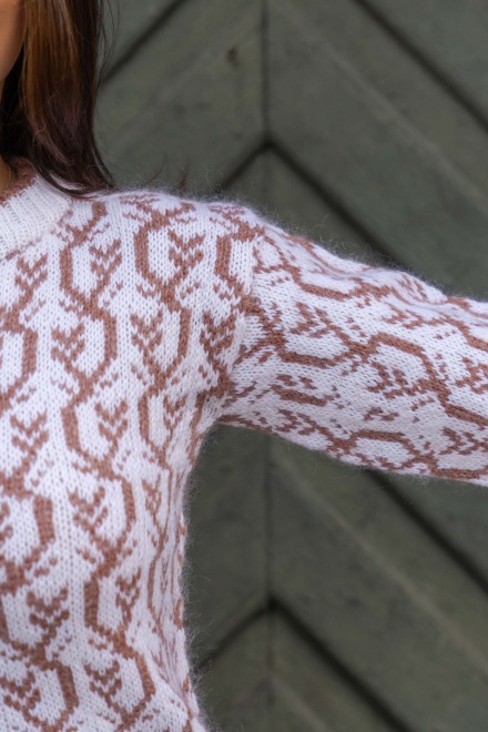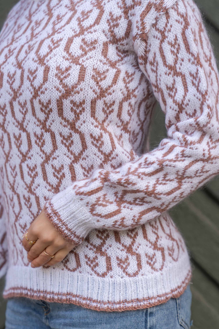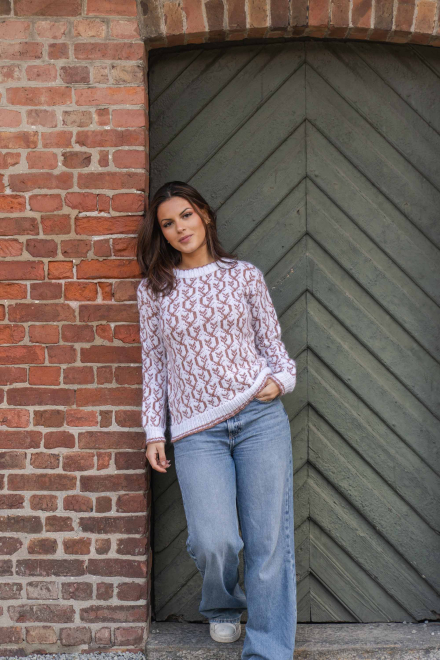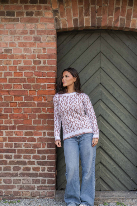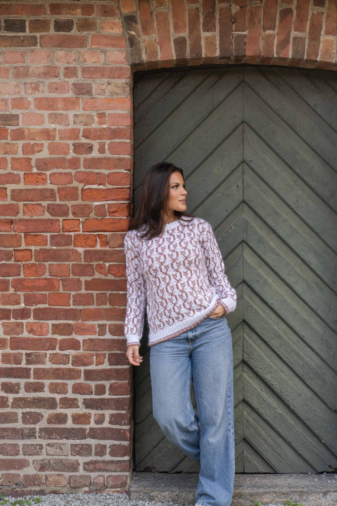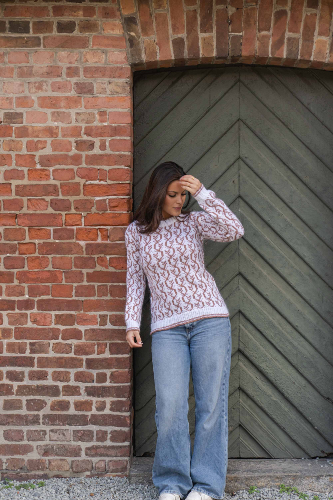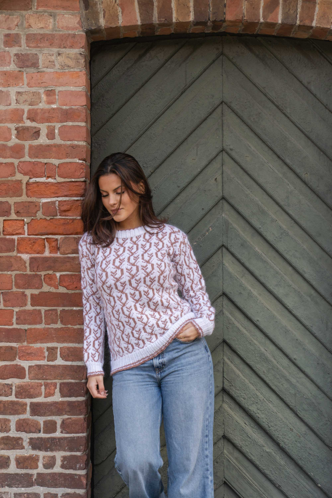 Du kan selv ændre farven på strikkepakken; vælg først den størrelse du vil strikke, så vises udvalget af farver herunder. Bemærk! Strikkeopskriften leveres altid i strikkepakkens originale farver: hvid, mocca mousse, hvid og beige rose